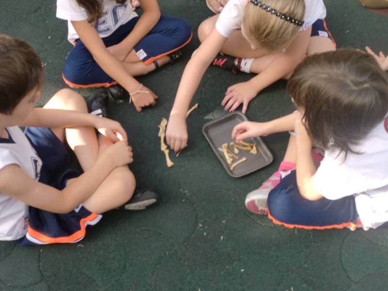 A importância dos sítios arqueológicos e da paleontologia foi apresentada para os alunos do 1º ano do Ensino Fundamental na aula de Natureza e Sociedade. As Prof.ªs Valquíria Castilho, Kellyn Regina, Roberta Achkar, Eny Razzante e Sheila Cristina organizaram uma atividade prática que envolveria muita curiosidade e procura, isso porque as professoras transformaram o parque em um sítio arqueológico. Com a simulação, os alunos deveriam formar duplas ou trios, e, usando pincel, luva, espátula e lupa, procurar fósseis escondidos. Durante as descobertas, todos fotografaram e anotaram as conquistas.