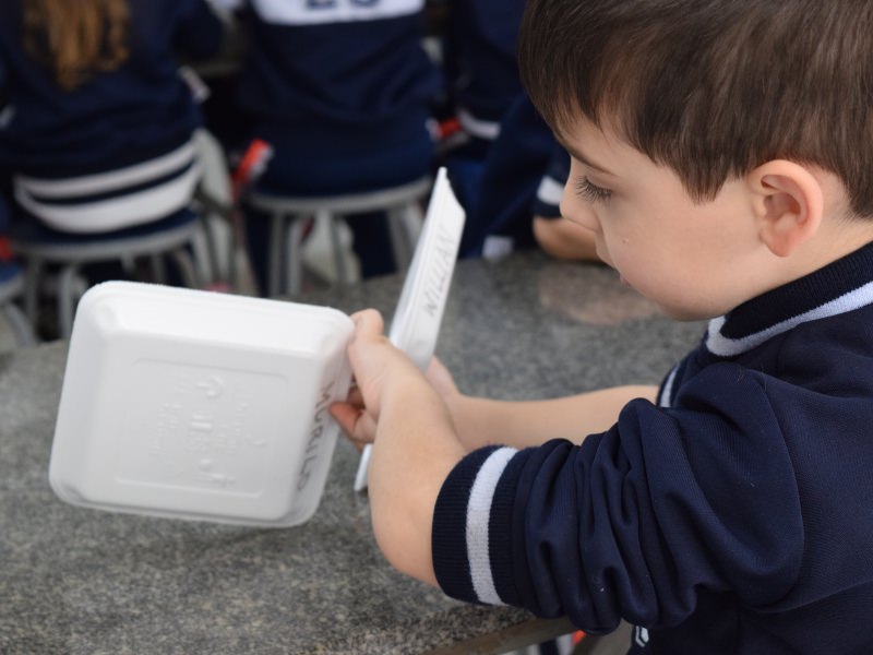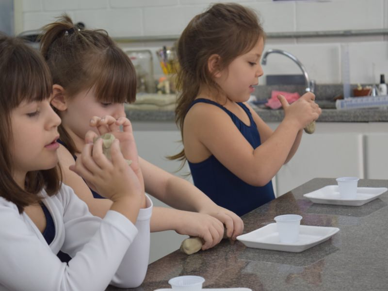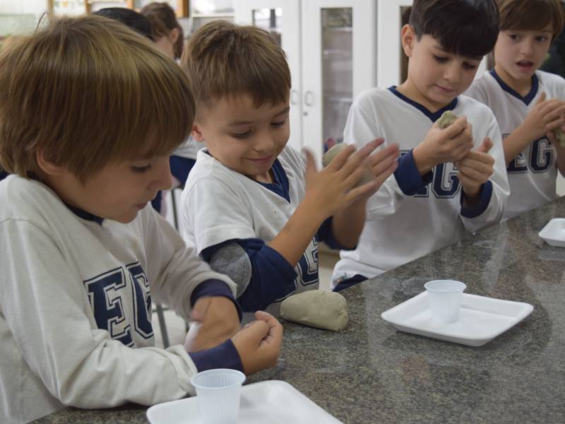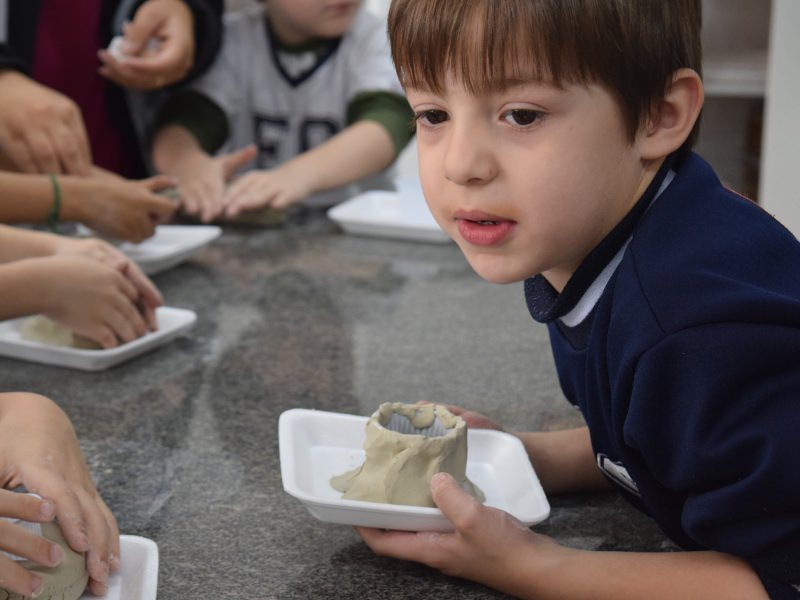 Com o auxílio do Prof. Carlos Sebode, os pequenos usaram argila e copo de plástico para a construção, forrando o copo com a massa preparada e pintaram o modelo com tinta vermelha, para representar a lava.