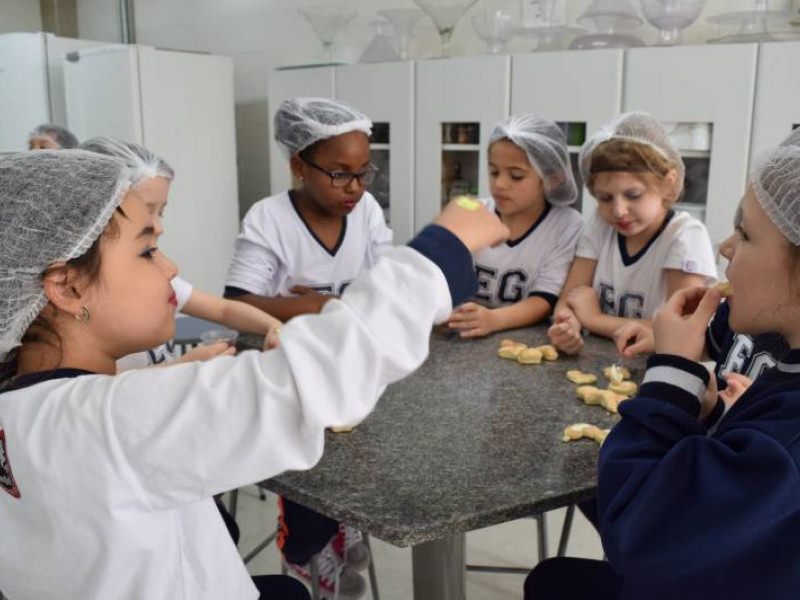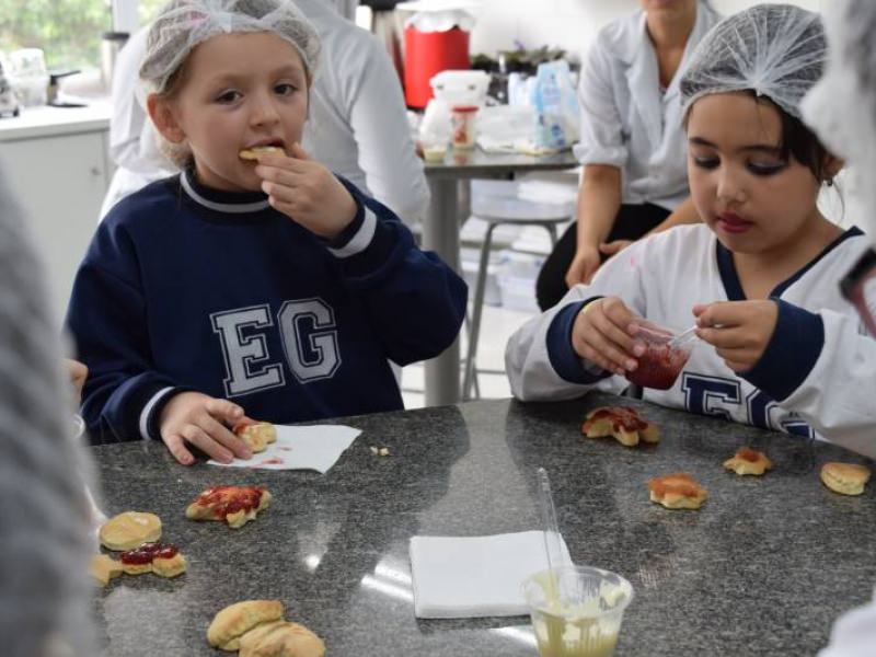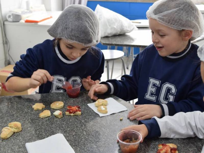 A receita foi desenvolvida pela Nutricionista Thaísa Pereira, com a ajuda das estagiárias de Nutrição. As crianças modelaram os biscoitos e, depois de assados, fizeram a degustação com os recheios.