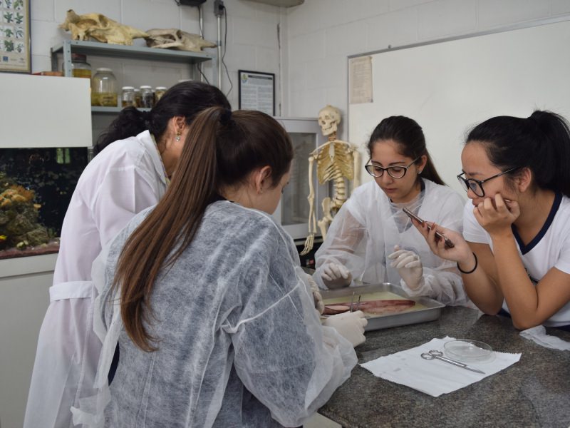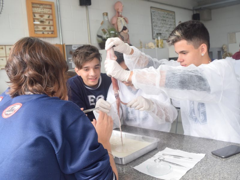 Em um primeiro momento, os alunos dissecaram um peixe, como foi explicado em 2 de maio, no texto “Dissecando um peixe ósseo”. Já na semana do dia 8 de maio, com o auxílio do Prof. Carlos Sebode, foi a vez de os jovens dissecarem a Lula, molusco que tem sua morfologia e anatomia bem diferente do corpo humano. Um exemplo é que, para analisar a boca do animal, é preciso abrir os tentáculos.
