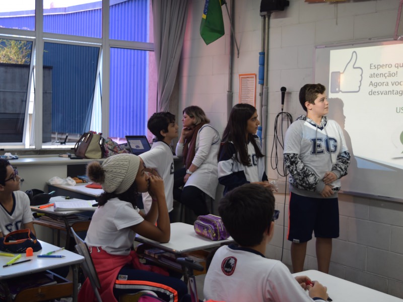 Durante a apresentação, as crianças de 4º e 5º anos levantaram questões para os jovens do 7º, que, por sua vez, responderam, baseando-se nas pesquisas realizadas. Ao final da apresentação, todos aprenderam o que devemos postar na internet e o que devemos deixar de “modo privado”.