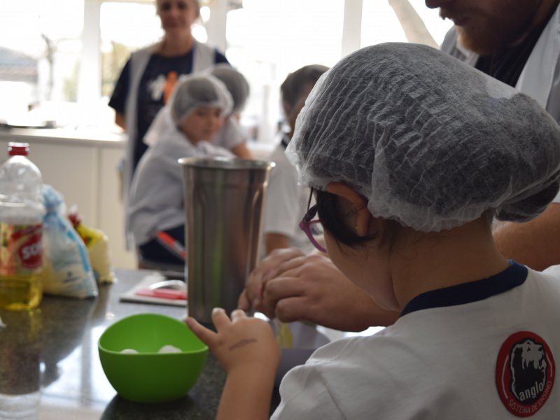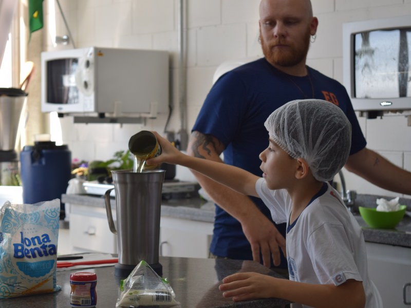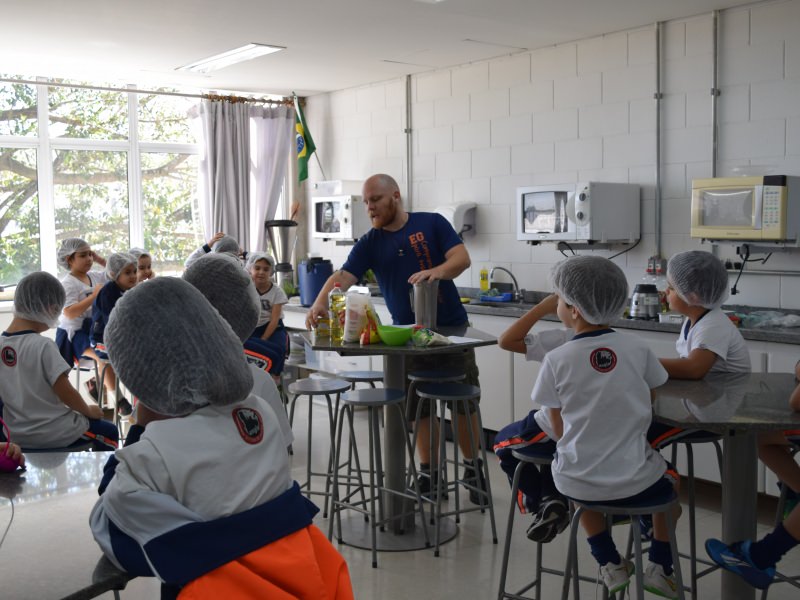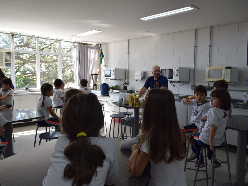 Para encerrar o tema estudado, as professoras do 1º ano, em conjunto com o Professor da cozinha experimental Carlos Sebode, resolveram propor uma atividade para os alunos, onde eles auxiliariam o professo Carlos a produzir um bolo de milho.
