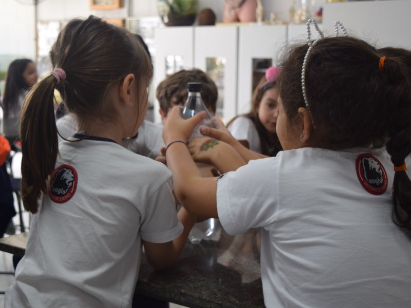 Em seguida, realizaram o experimento do submarino, utilizando uma tampa de caneta, massinha, uma garrafa pet e água. Nesse experimento, fizeram o “submarino”, colocaram-no dentro da garrafa com a água e a apertaram, aumentando e diminuindo a pressão na garrafa, o que resultou na movimentação do submarino, do topo até o fundo da garrafa.