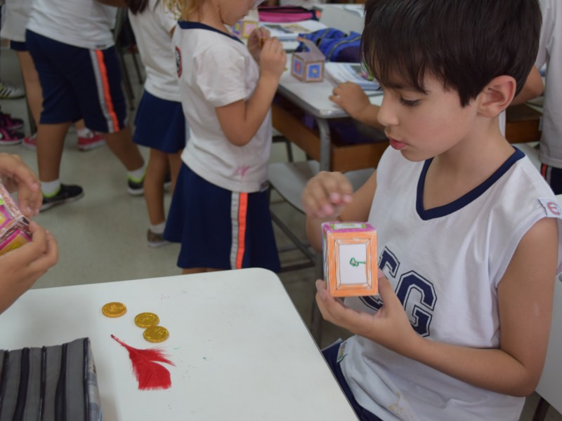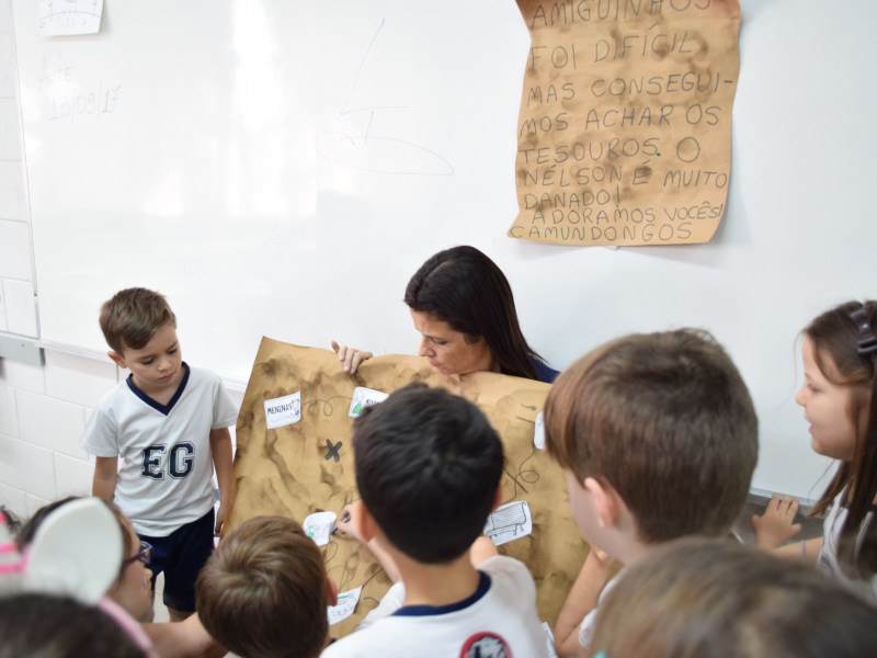 A atividade, além de incentivar o gosto pela leitura, estimula a imaginação das crianças, por fazer com que procurem, com afinco, o tesouro. A curiosidade em saber onde ele estará fez com que se empolgassem, “dando vida” às pistas encontradas.
