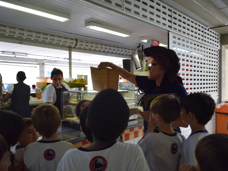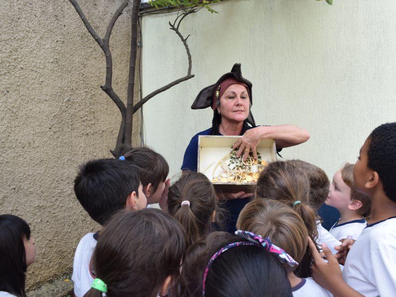 Com os alunos do 1º ano do Ensino Fundamental não foi diferente, as professoras propuseram uma atividade semelhante à situação da apostila, relacionada a piratas e caça ao tesouro, baseada no livro “Caça ao tesouro”, escrito por A. J. Wood.