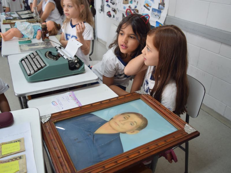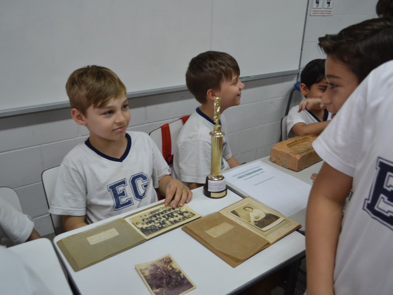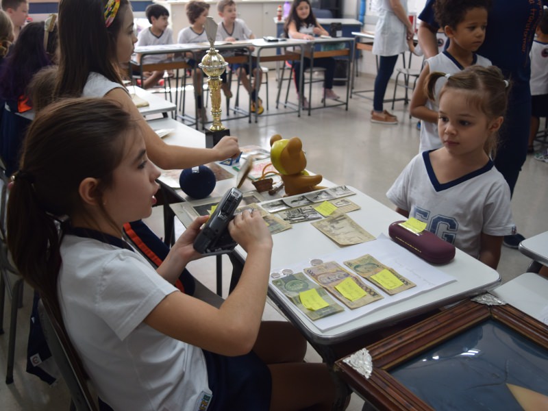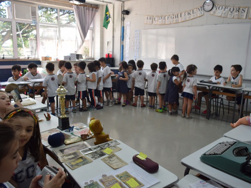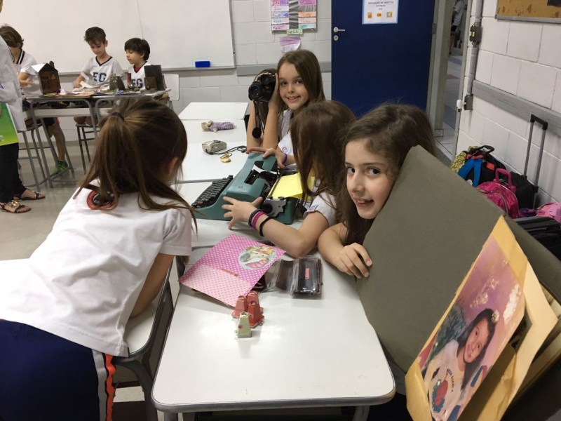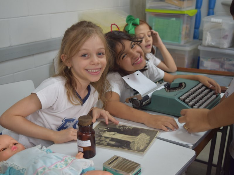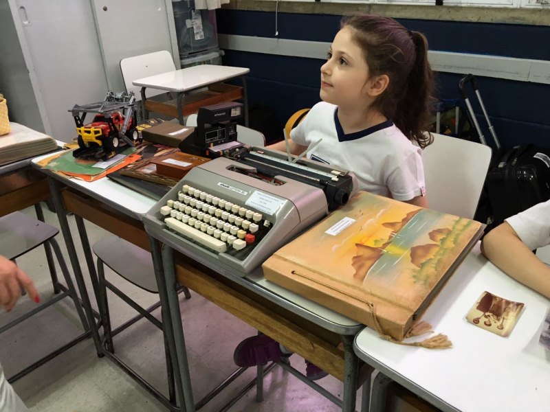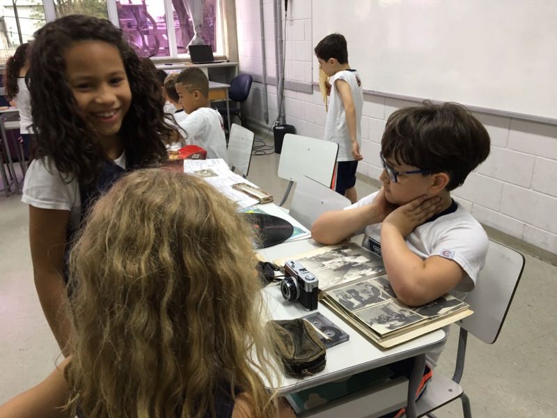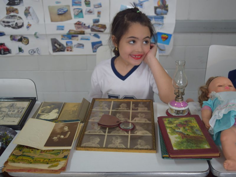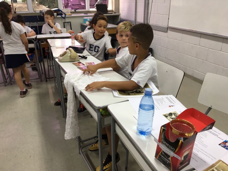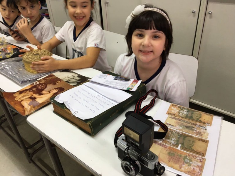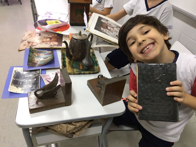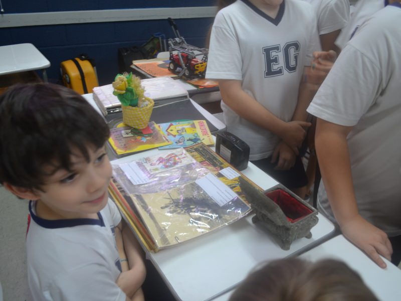 A apostila Anglo propôs aos alunos que trouxessem para a classe objetos antigos que estivessem relacionados com as suas famílias, como fotografias, relógios, quadros, máquinas de escrever, câmeras fotográficas etc. Com os objetos, os alunos montaram uma exposição para apresentar aos colegas e às professoras as suas histórias.