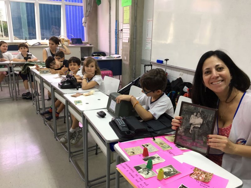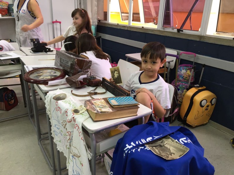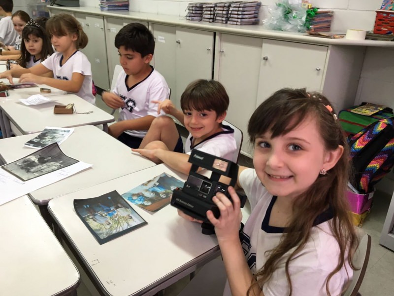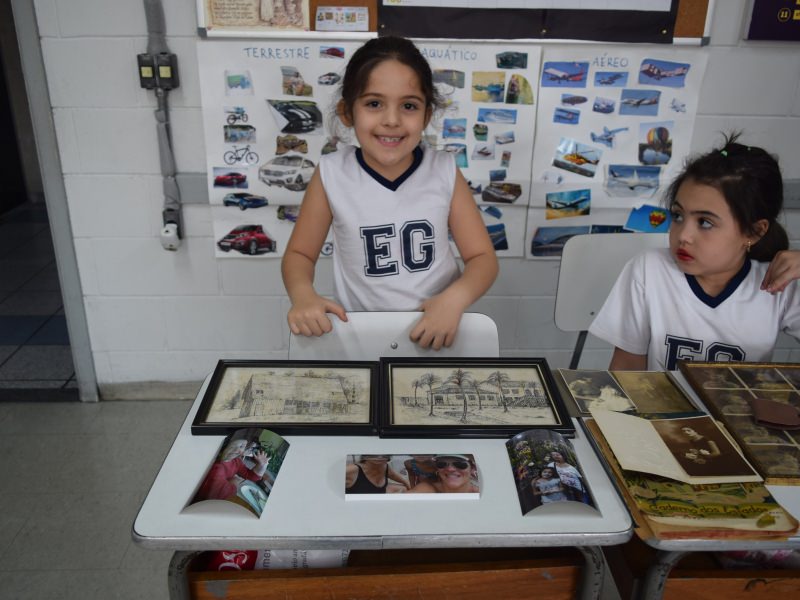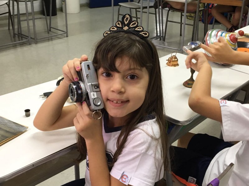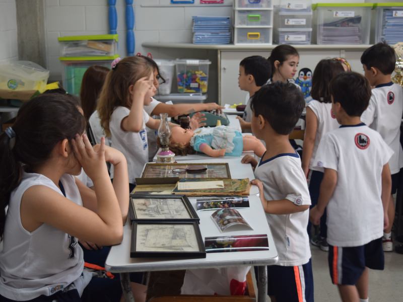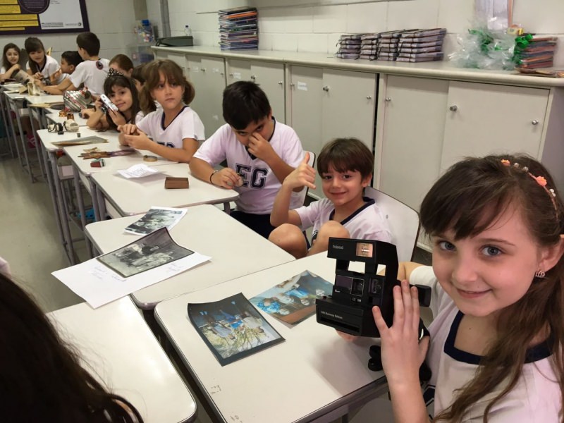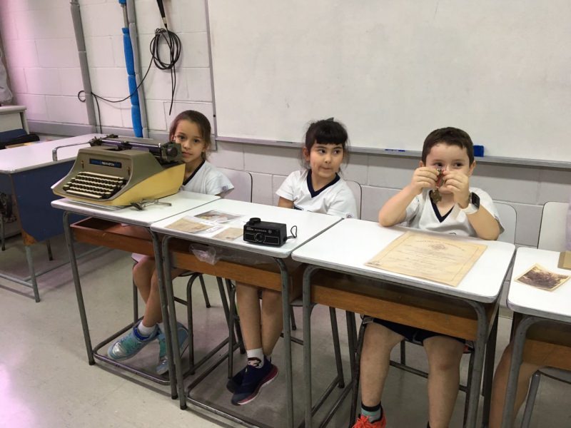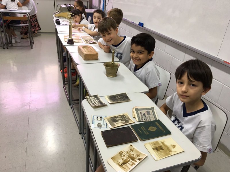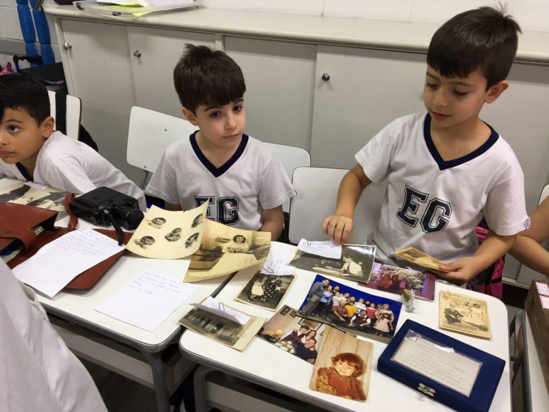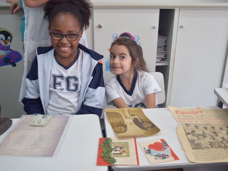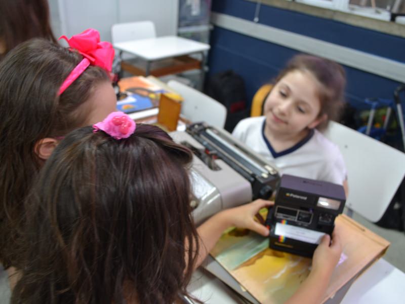 A apostila Anglo propôs aos alunos que trouxessem para a classe objetos antigos que estivessem relacionados com as suas famílias, como fotografias, relógios, quadros, máquinas de escrever, câmeras fotográficas etc. Com os objetos, os alunos montaram uma exposição para apresentar aos colegas e às professoras as suas histórias.