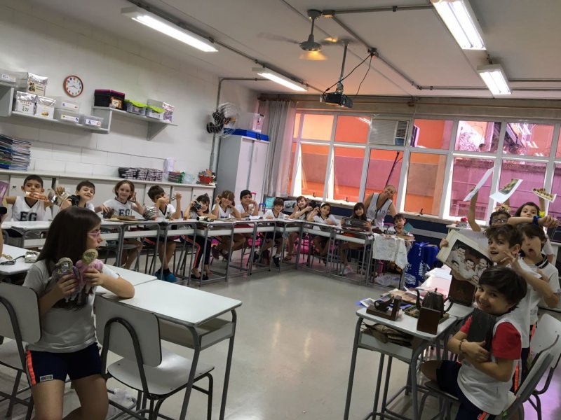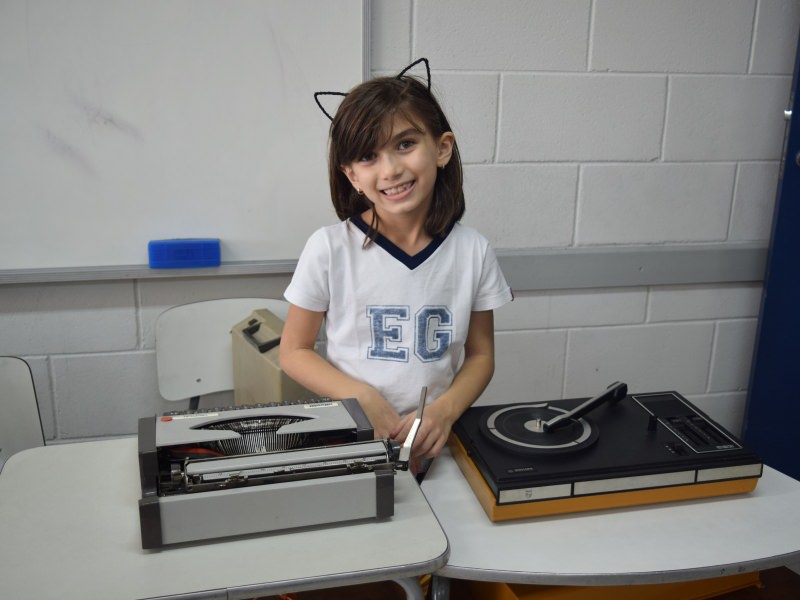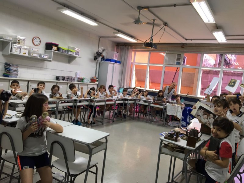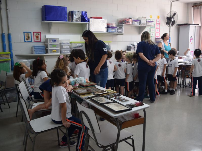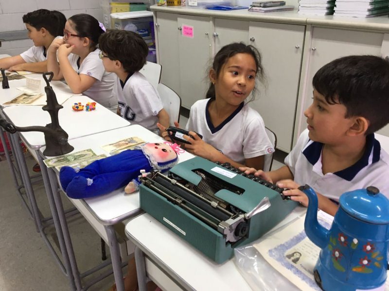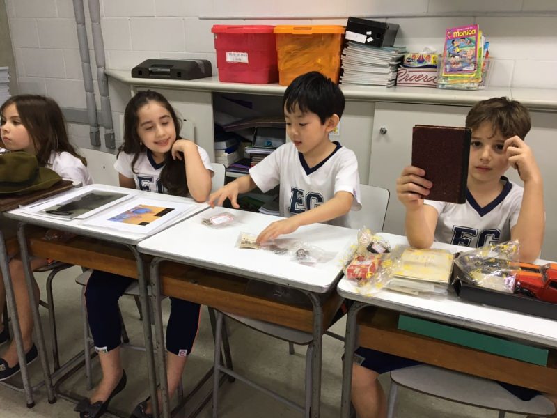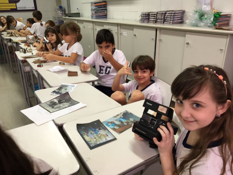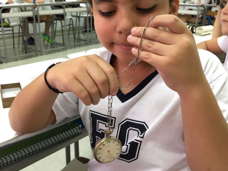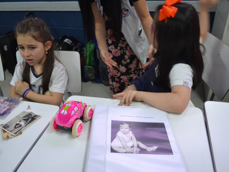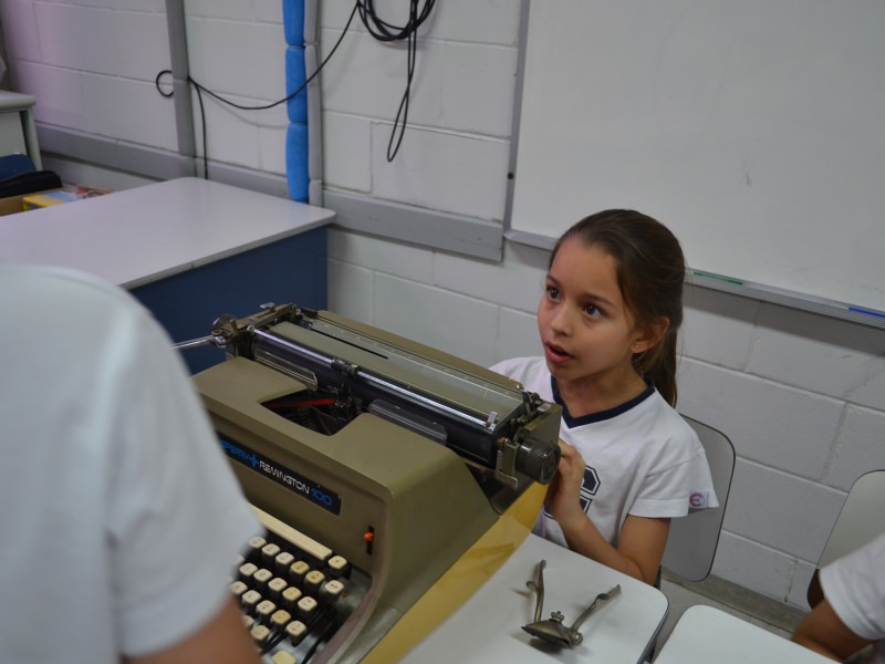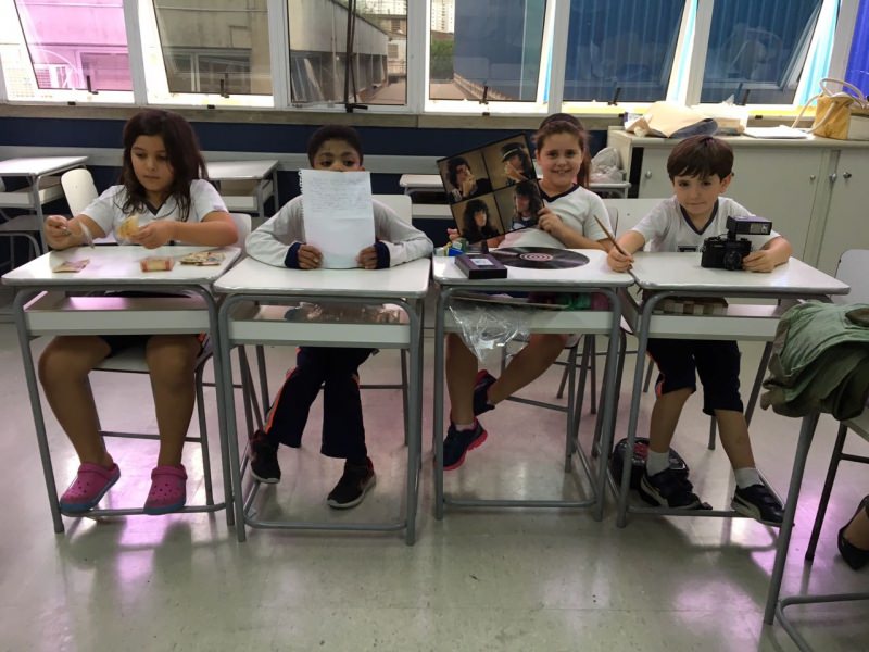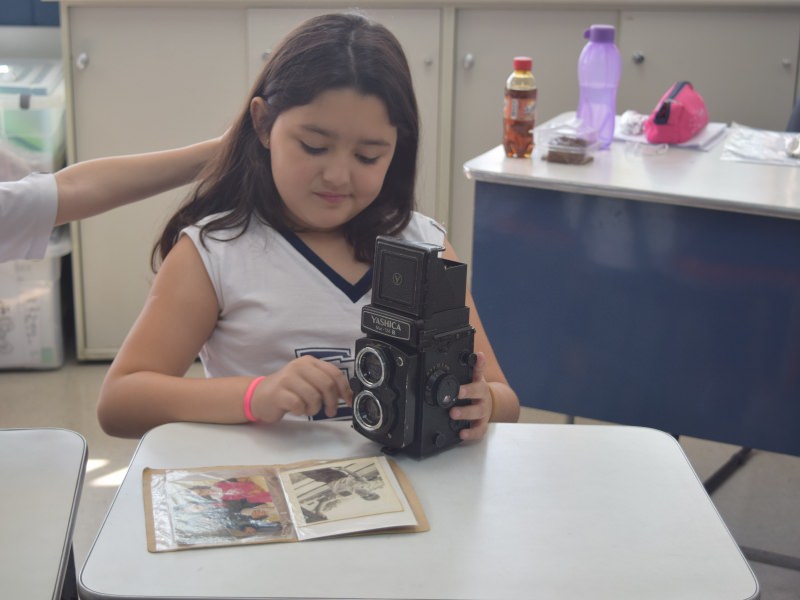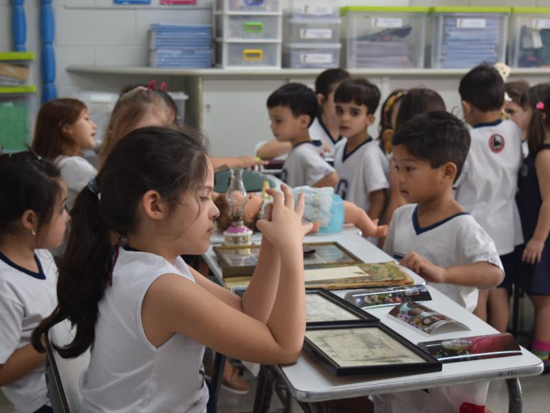 A apostila Anglo propôs aos alunos que trouxessem para a classe objetos antigos que estivessem relacionados com as suas famílias, como fotografias, relógios, quadros, máquinas de escrever, câmeras fotográficas etc. Com os objetos, os alunos montaram uma exposição para apresentar aos colegas e às professoras as suas histórias.