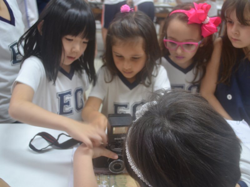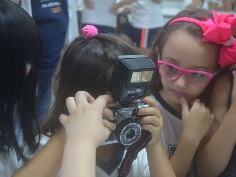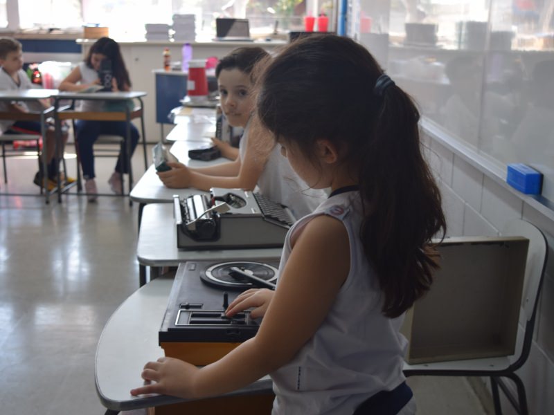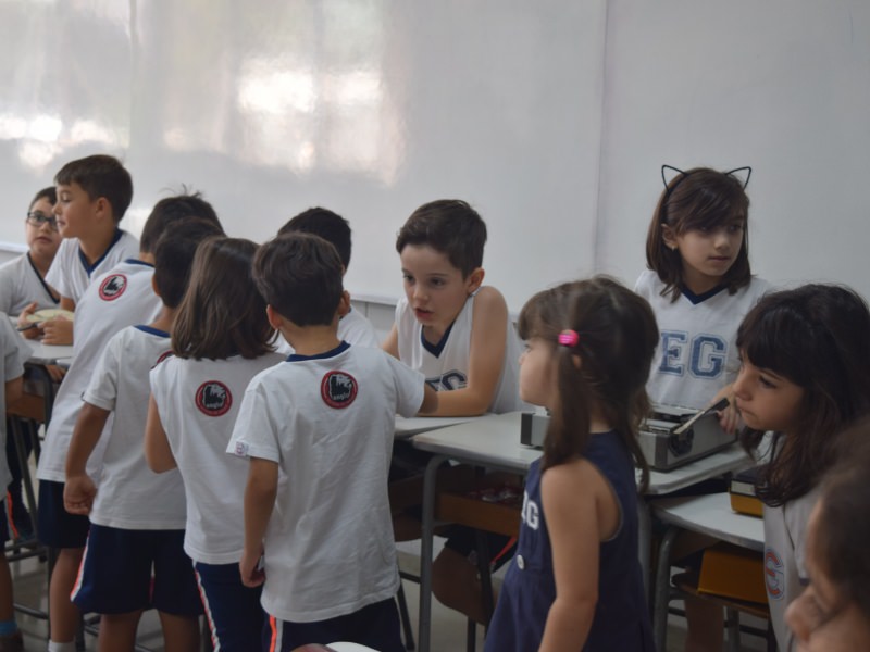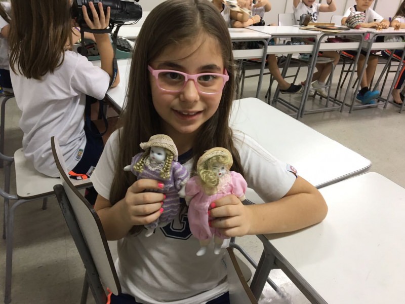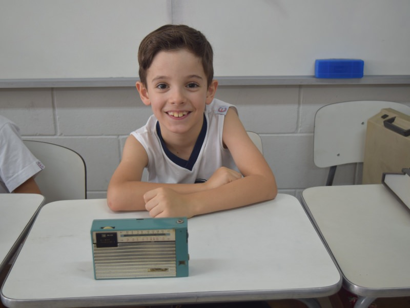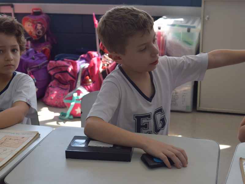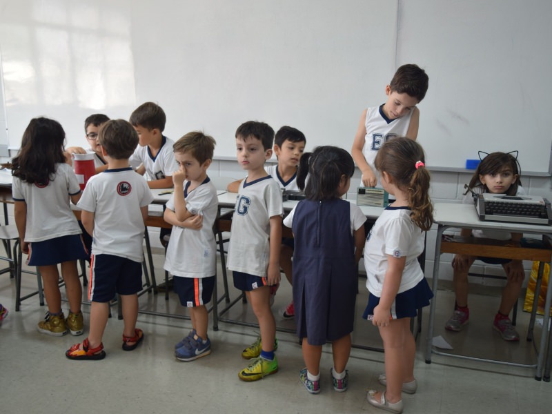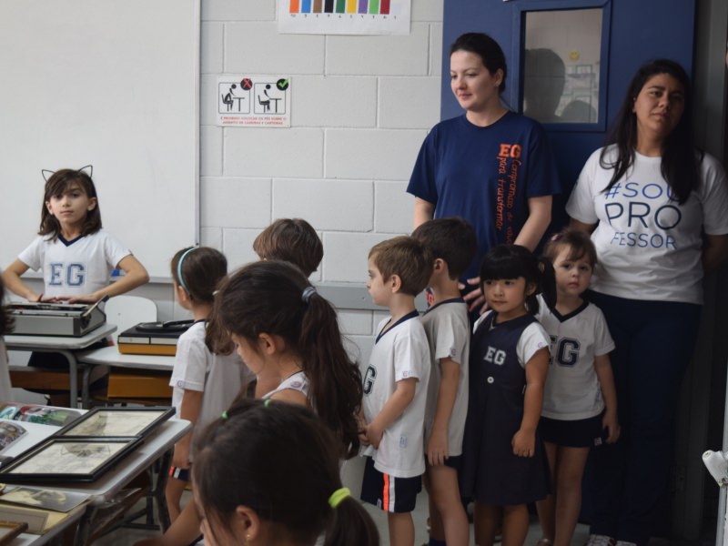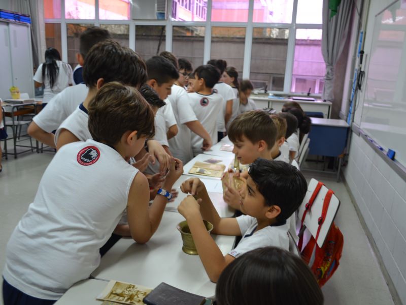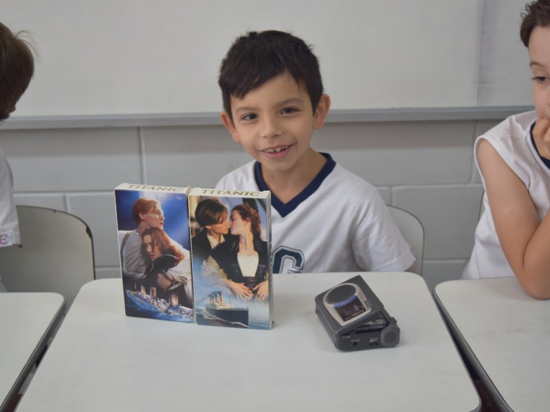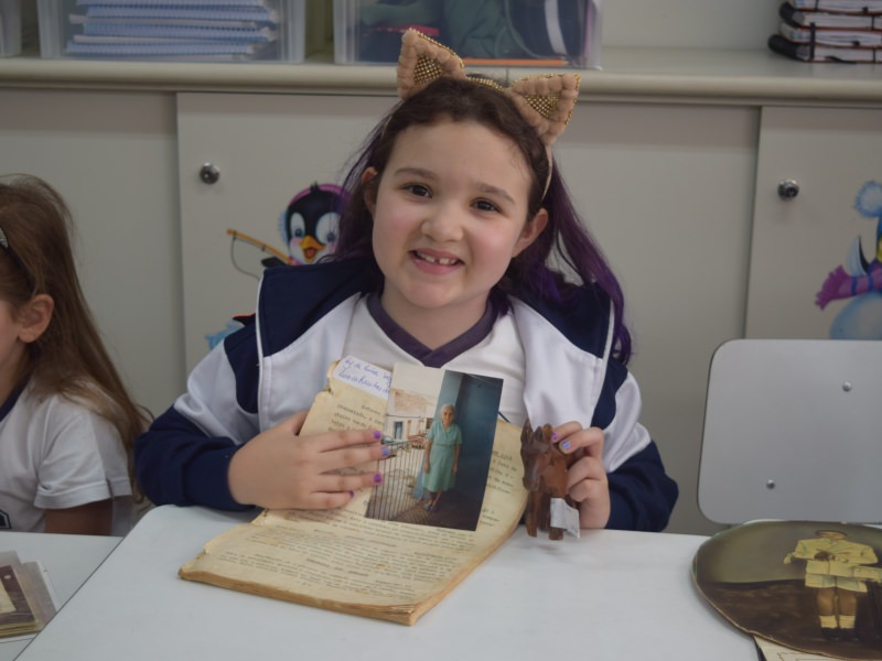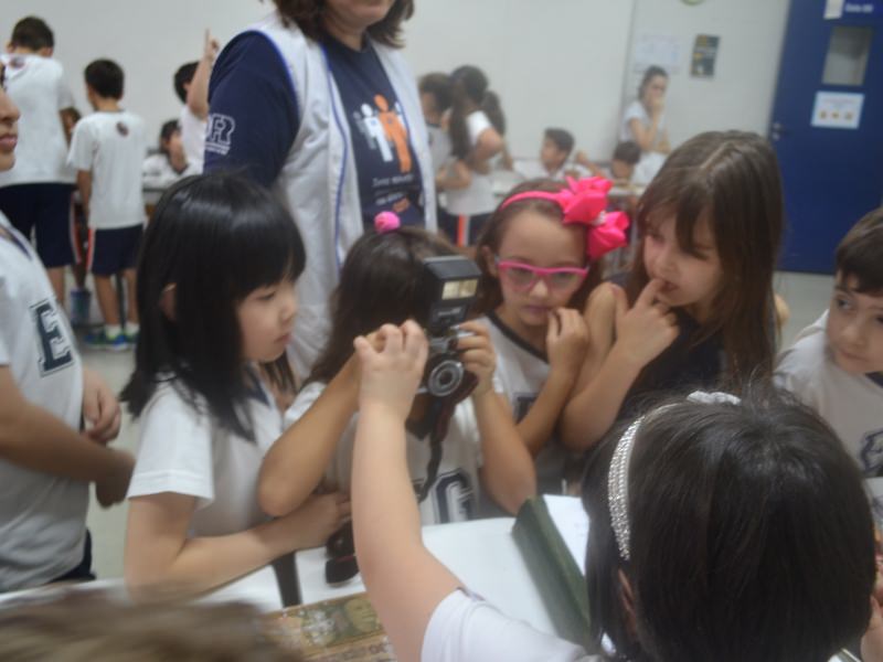 A apostila Anglo propôs aos alunos que trouxessem para a classe objetos antigos que estivessem relacionados com as suas famílias, como fotografias, relógios, quadros, máquinas de escrever, câmeras fotográficas etc. Com os objetos, os alunos montaram uma exposição para apresentar aos colegas e às professoras as suas histórias.