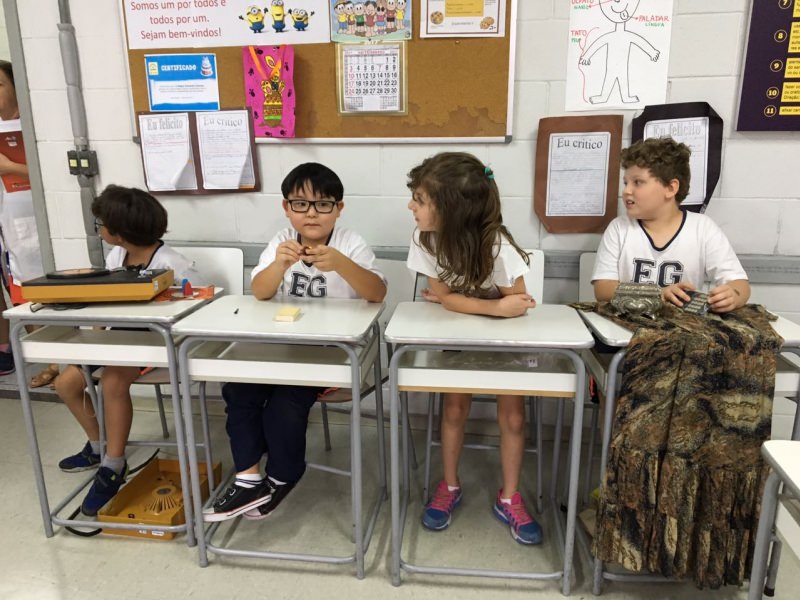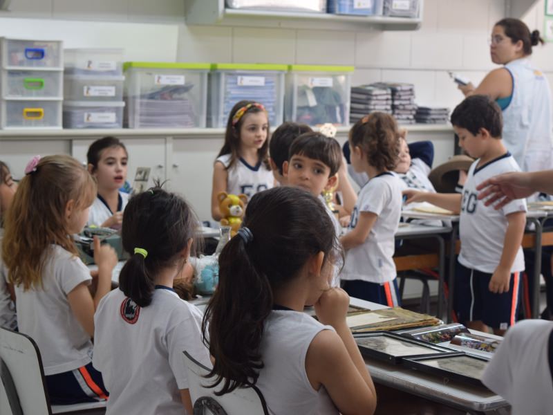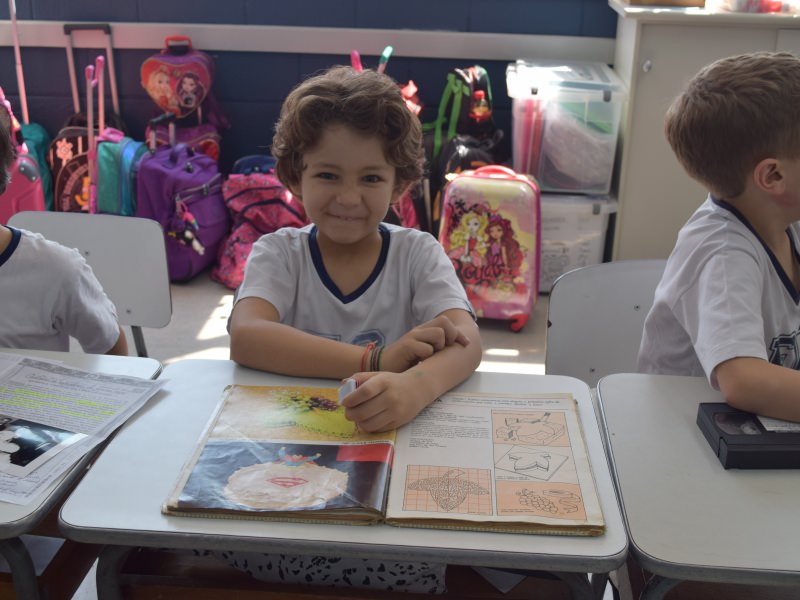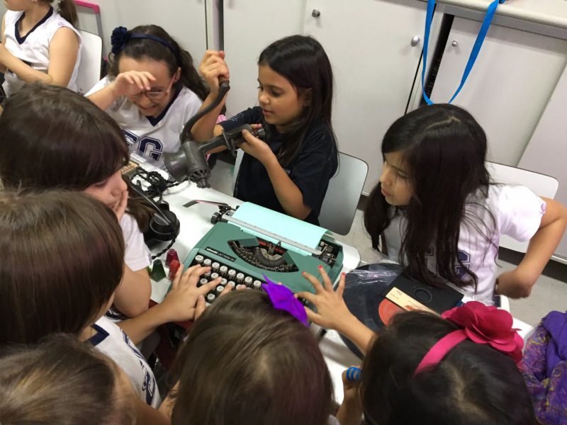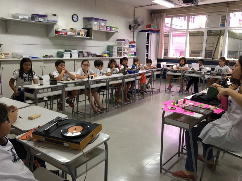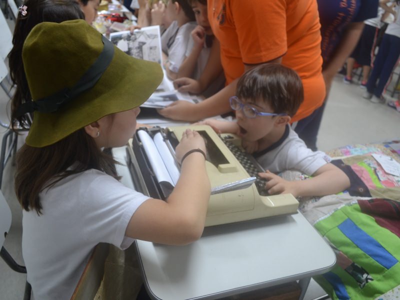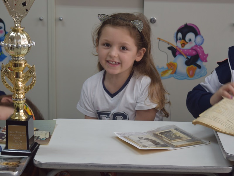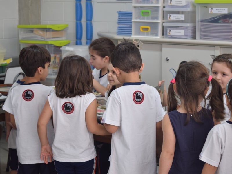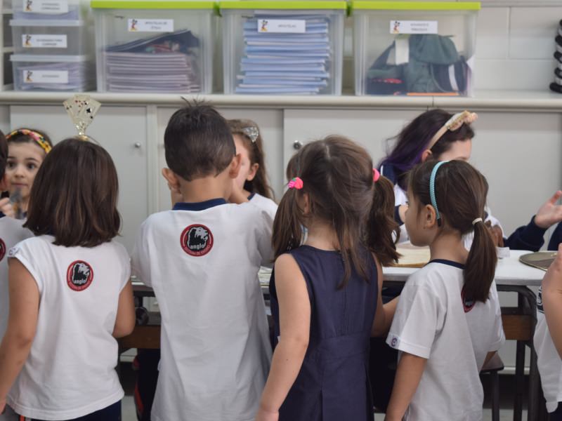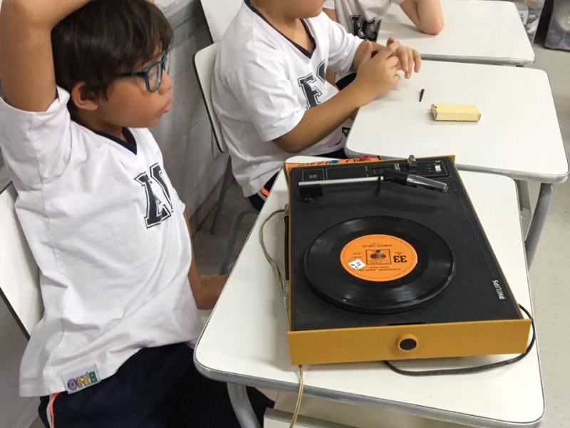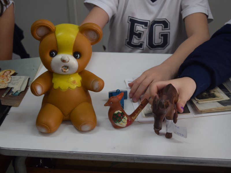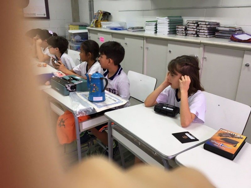 A apostila Anglo propôs aos alunos que trouxessem para a classe objetos antigos que estivessem relacionados com as suas famílias, como fotografias, relógios, quadros, máquinas de escrever, câmeras fotográficas etc. Com os objetos, os alunos montaram uma exposição para apresentar aos colegas e às professoras as suas histórias.