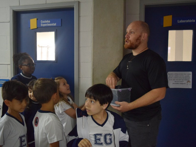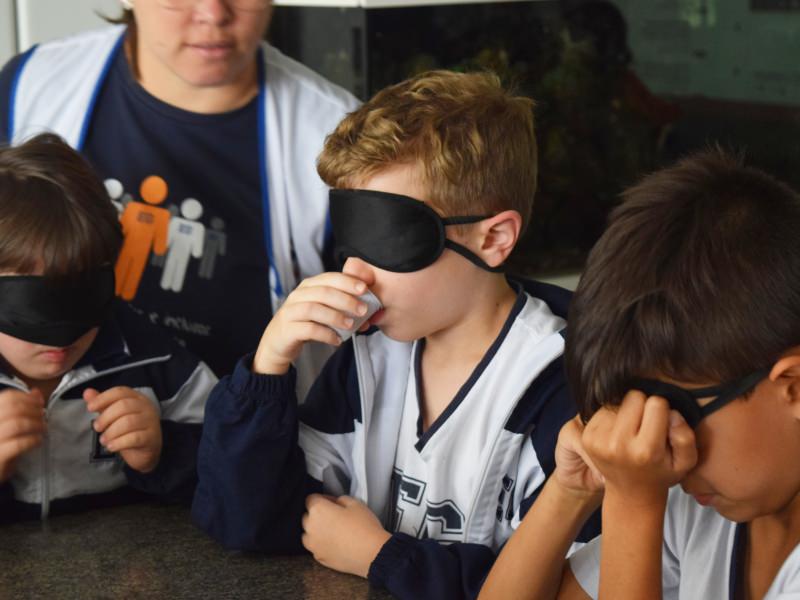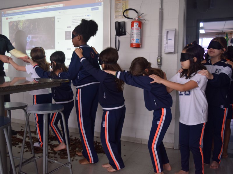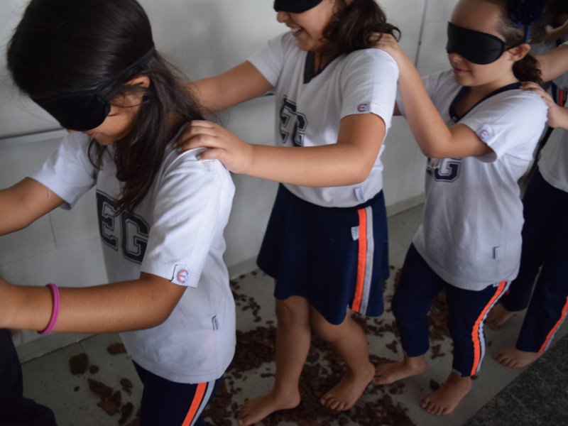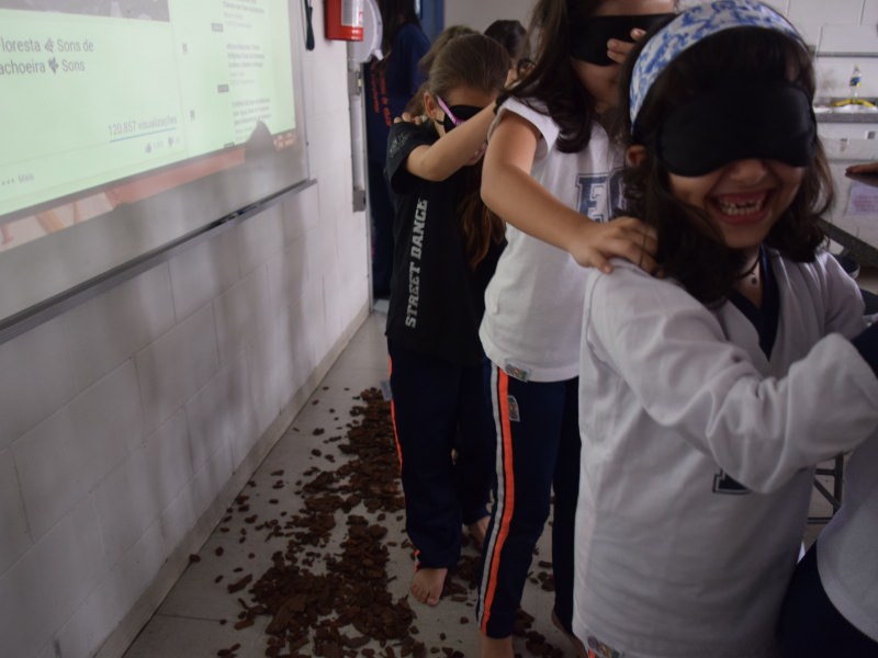 Os alunos do 2° ano do Ensino Fundamental realizaram alguns experimentos no laboratório, nos quais as sensações eram relacionadas aos sentidos do corpo. Eles provaram, vendados, comidas, cheiros, texturas, ouviram sons da cidade, das florestas, dos mares etc.