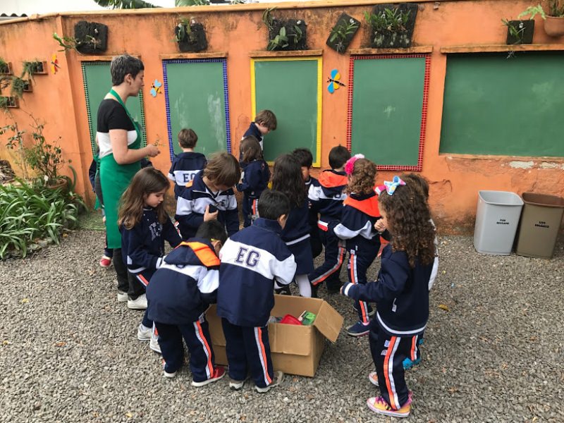 Coleta seletiva foi outro tema abordado para ensinar aos estudantes a importância da preservação do meio ambiente. Exercícios foram realizados para que aprendessem a jogar cada tipo de lixo na lixeira correta.