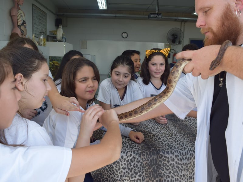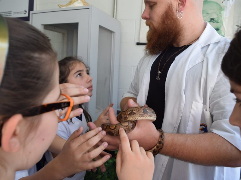 Ao final da aula, os estudantes tiveram uma surpresa e conheceram dois répteis, um macho e uma fêmea, pertencentes ao professor Carlos Sebode. Em seguida, ficaram à vontade para observar a decoração do laboratório e as diversas espécies de animais empalhados ou em conservação.