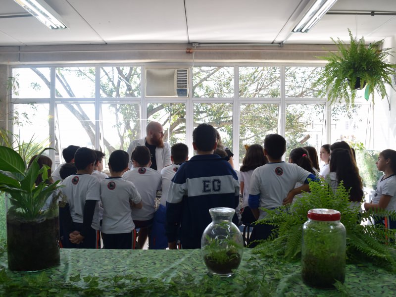 Plantas e terrários enfeitavam a mesa 2, cujo objetivo era enfatizar a importância de cuidar da natureza. O professor Carlos destacou que as florestas são o ar-condicionado do mundo e que as plantas também precisam de água, assim como todo ser vivo.