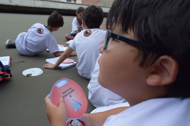 Para a execução da atividade, eles necessitaram de um identificador de nuvens, que o Caderno Anglo disponibilizou, e um local com espaço aberto para a observação das nuvens. Durante a atividade, os alunos reuniram-se em grupos, e cada grupo observou as nuvens que estavam no céu para identificá-las.