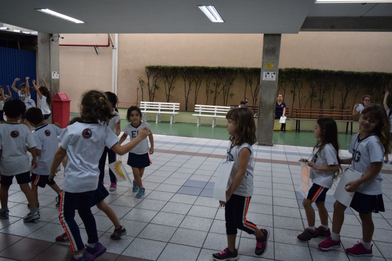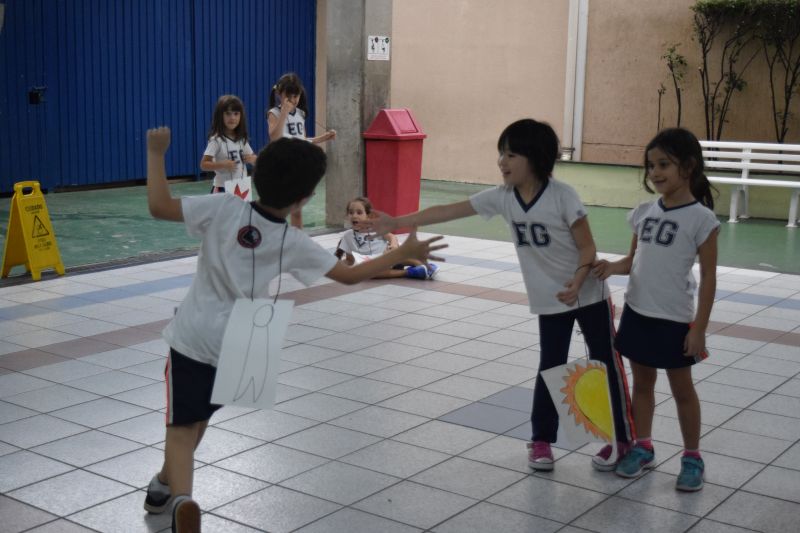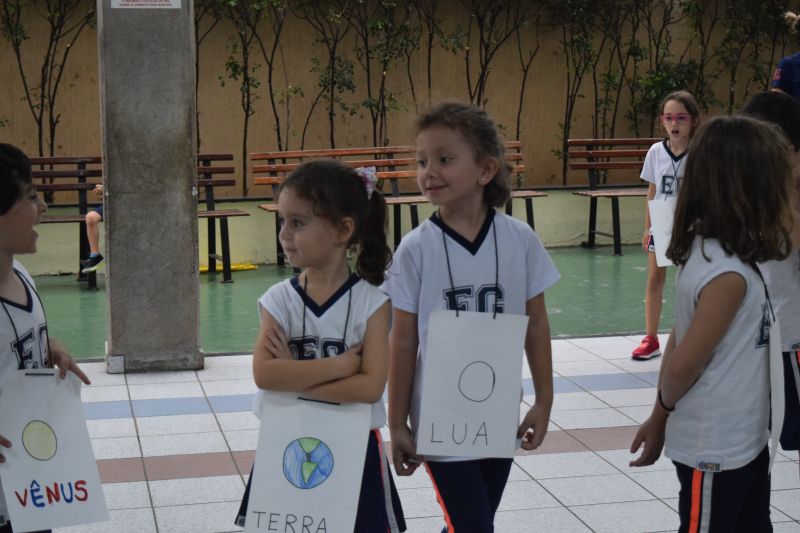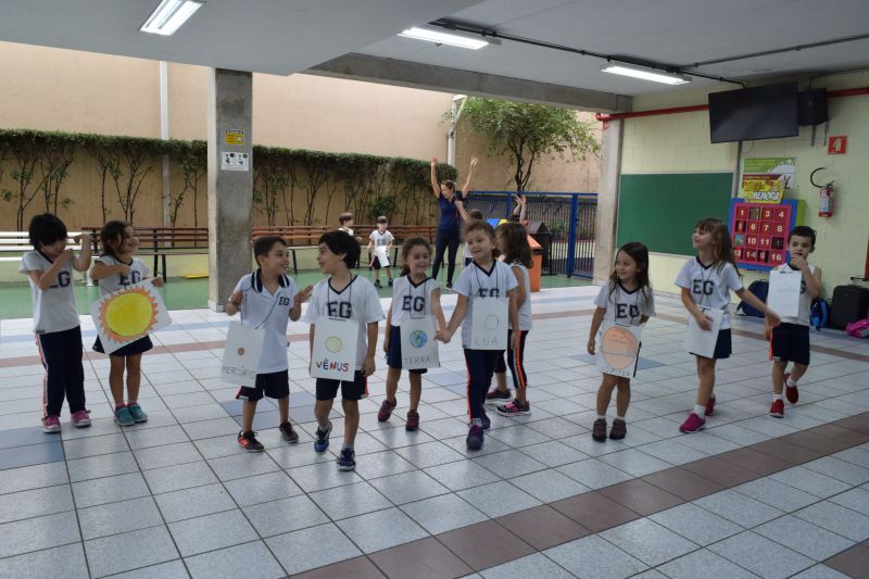 Durante a semana do dia 08 de março, para entenderem como funciona o sistema solar e sua órbita, brincaram de dança dos planetas, na qual cada aluno, usando plaquinhas, representou um planeta, e o restante simbolizava as estrelas, piscando ao redor. As placas foram sendo trocadas para que todos tivessem a oportunidade de ser Mercúrio, Vênus, Terra, Marte, Júpiter, Saturno, Urano, Netuno ou uma estrela.