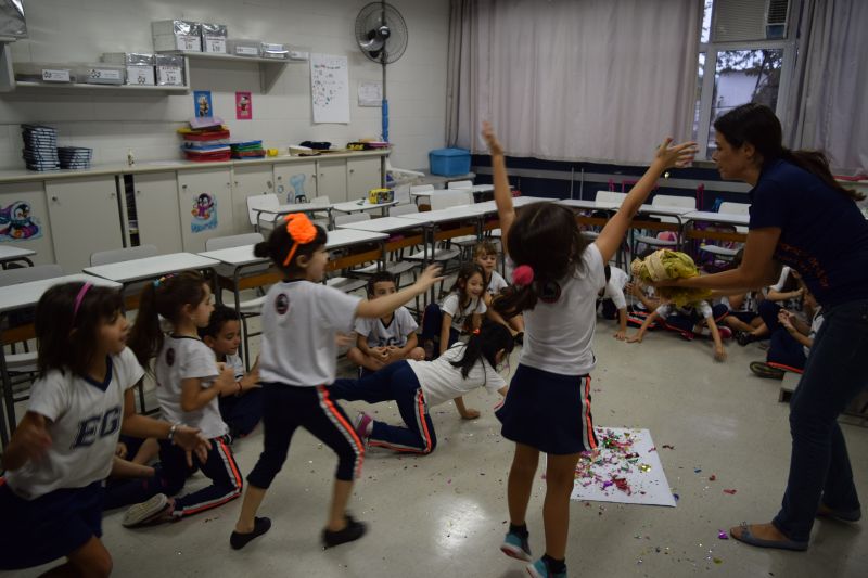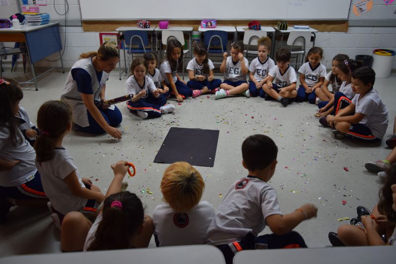 Para melhor entedimento, as professoras utilizaram um tubo de confetes para representar a grande explosão e explicar para os estudantes que, depois desse acontecimento, criou-se o espaço e o tempo, surgindo assim, o universo.