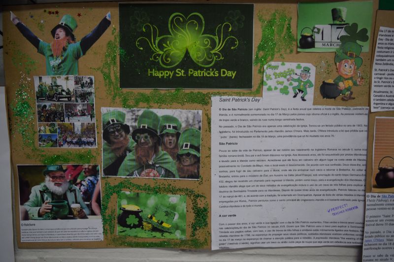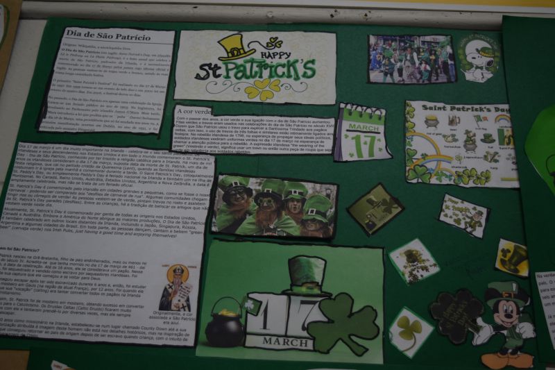 Os alunos de 4º e 5º anos receberam, como lição de casa, o dever de pesquisar sobre o Dia de São Patrício e trazer para a aula informações sobre a data, por que a cor verde é usada, a história, onde se comemora, quais as tradições, os amuletos e quatro imagens. Em seguida, reuniram-se em grupos e produziram cartazes com as informações que trouxeram.