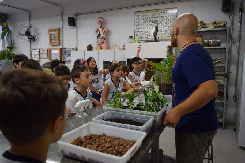 Para a montagem de um terrário, é necessário conhecer muito bem a natureza, em especial as plantas, uma vez que são a peça central do experimento. O 3º ano do Ensino Fundamental, sob orientação do Prof. Carlos Sebode, montou um terrário, como o estudado no material Anglo.