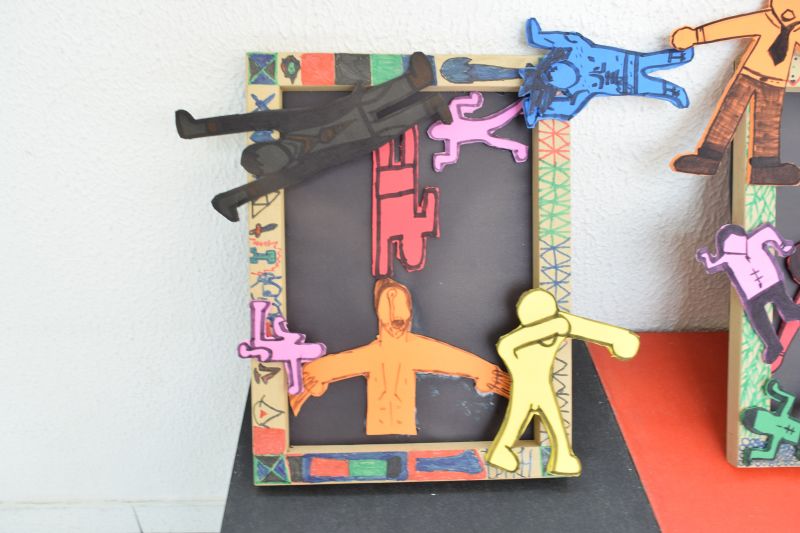 Divididos em grupos com 4 ou 5 componentes, deveriam elaborar um quadro, em relevo, com moldura de madeira, papéis e eva coloridos, explorando os movimentos do corpo e baseando-se nas obras do artista falecido Keith Haring.