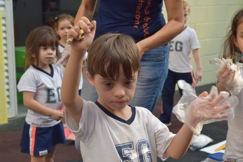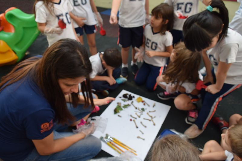 Os alunos do 1º ano estudaram sobre os fósseis e os cientistas que exploram locais em busca deles, os paleontólogos. O paleontólogo é o biólogo que estuda o passado da vida na terra, ou seja, os fósseis, que podem ser de dinossauros, plantas, animais da era glacial, insetos, pedras, conchas etc.