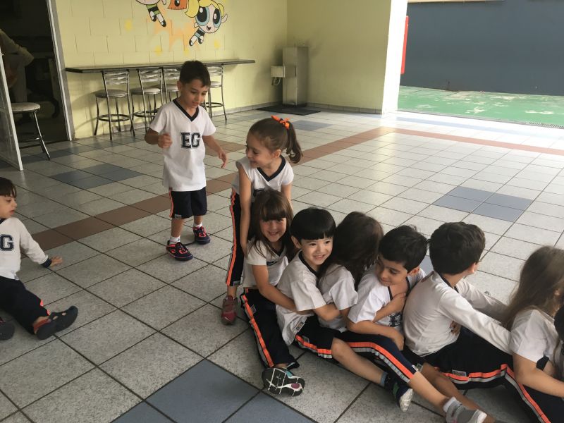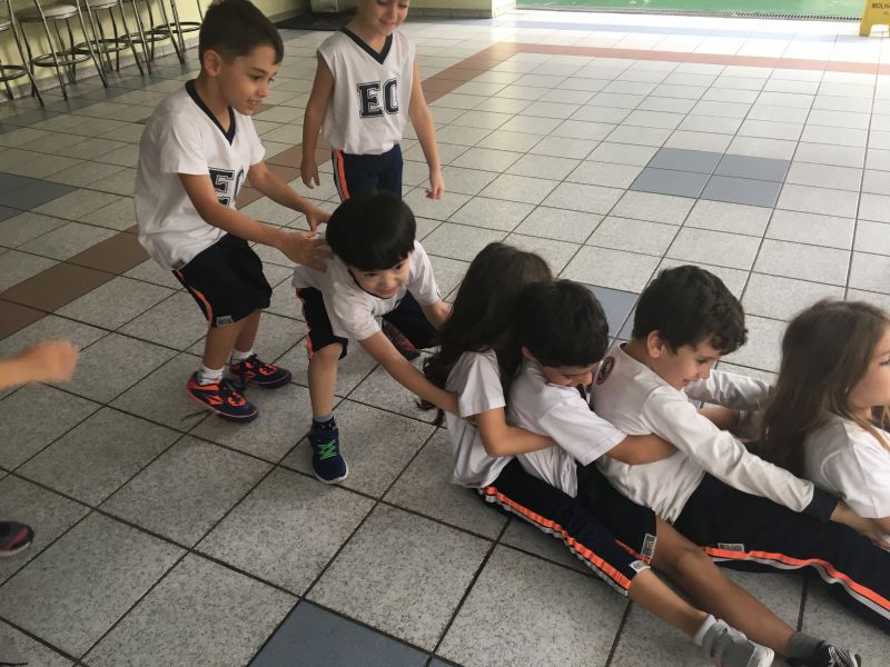Para que os alunos vivenciassem uma experiência da colheita da mandioca, de forma lúdica, as professoras propuseram que realizassem uma brincadeira. As crianças se sentam no chão, em fila, e abraçam com firmeza o amigo que está na sua frente. O último da fila levanta para “colher” o colega posicionado à sua frente, e esse processo se repete ate que o primeiro da fila seja “colhido”.