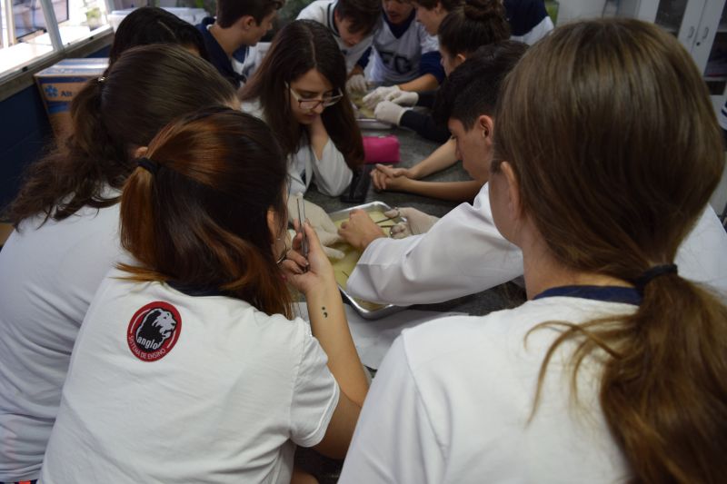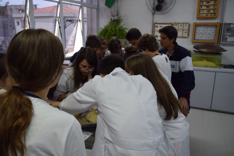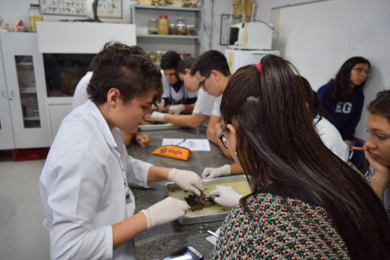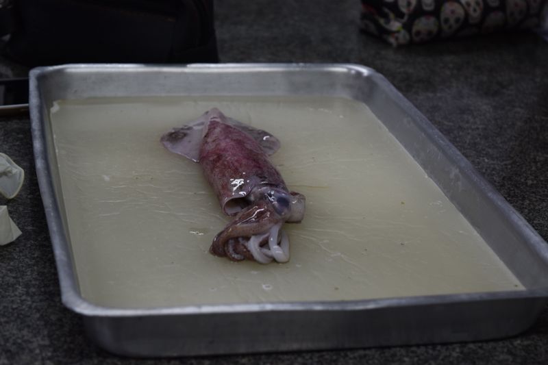 Para vivenciarem a matéria, a Prof.ª Valquíria propôs aos alunos que realizassem uma dissecação de lula. Ainda serão realizadas dissecações de outros animais, como frango e rã, e em vísceras de porco e de boi.