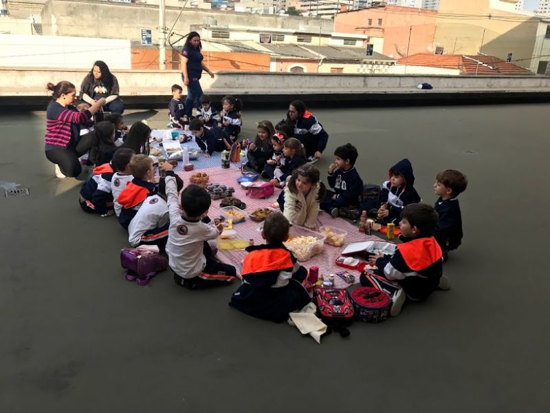 Os pequenos produziram um painel de fotos com seus familiares, trouxeram receitas de casa e, para finalizar, realizaram um piquenique com os lanches de que mais gostam.