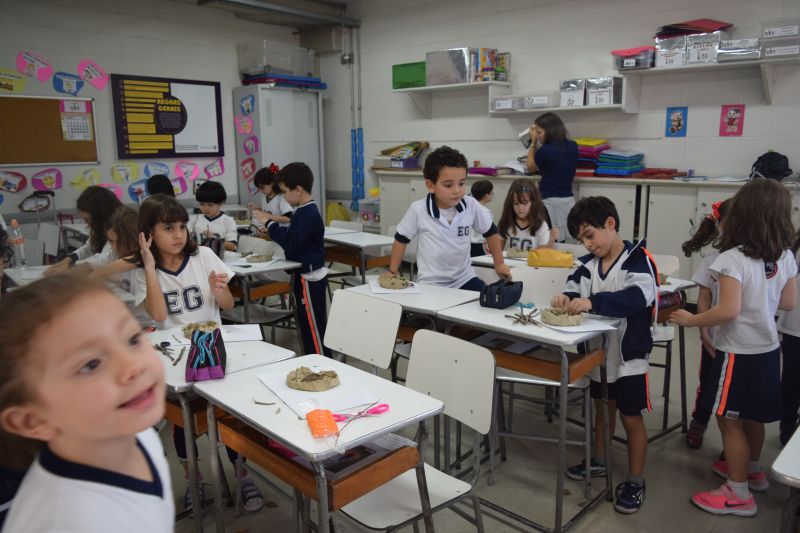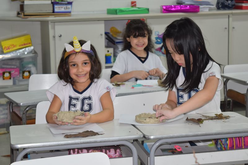 Após responderem a questões no material Anglo, realizaram uma atividade prática: montar um ninho. Utilizaram argila, graveto, folhas secas e massa de biscuit para produzir os pássaros e os ovos.
