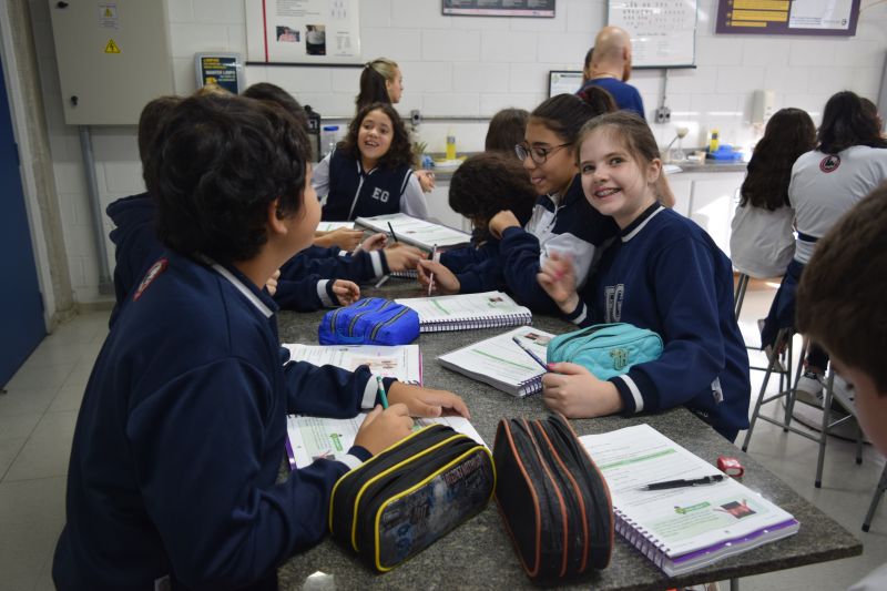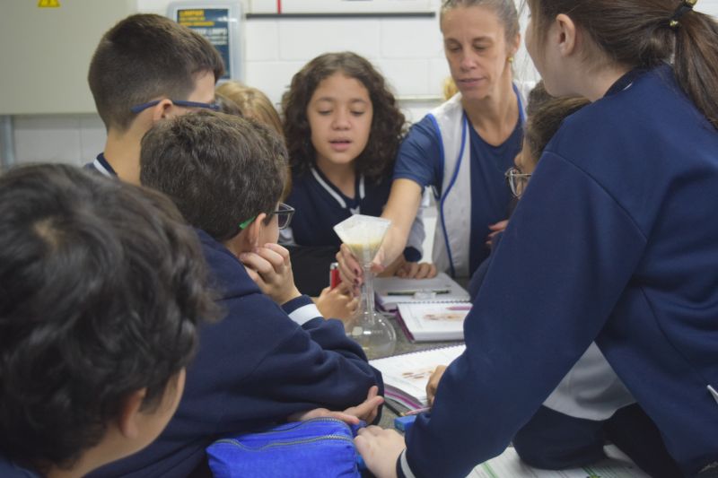 Os alunos do 5º ano realizaram uma experiência no laboratório, com o auxílio dos professores Valéria Siviero, Michele Berteli e Carlos Sebode, utilizando água, filtro de papel e seu suporte, copo vazio, areia e colher.