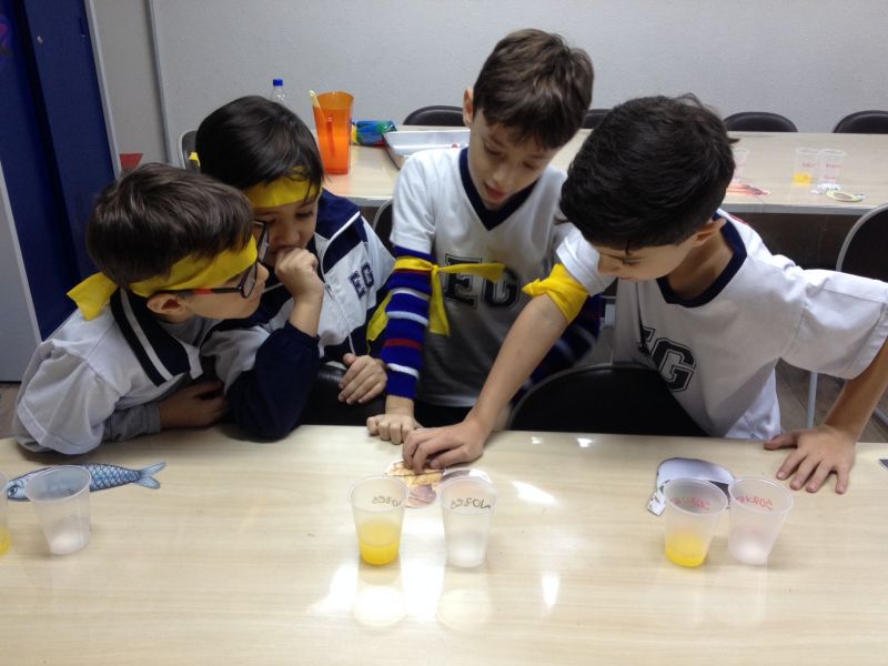 Com as turmas do Ensino Fundamental I, foi realizada uma dinâmica em que os alunos associavam os tipos e as quantidades de gordura a cada alimento apresentado.