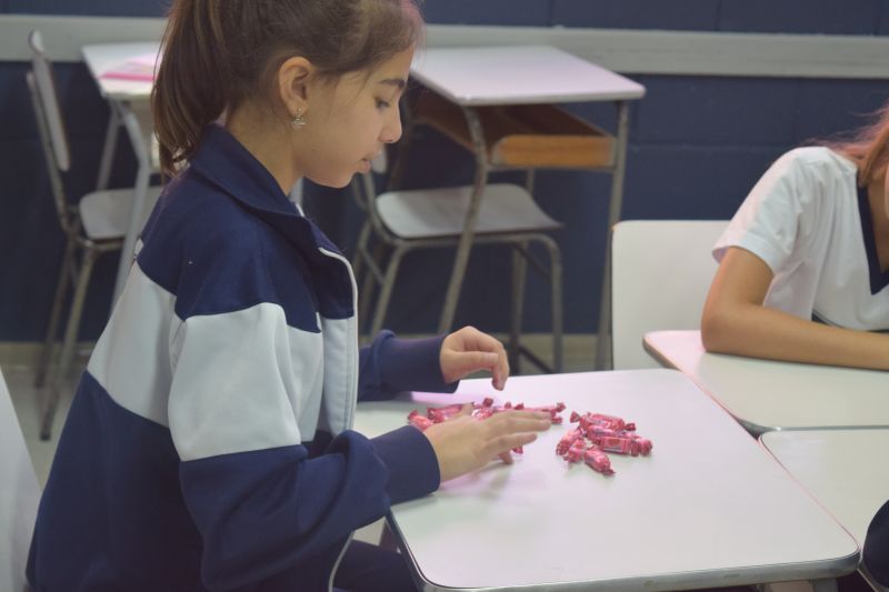 Na primeira aula, a professora levou bolo para os alunos, que ganhavam um pedaço à medida que iam respondendo corretamente às perguntas. As balas, aos serem entregues, eram separadas em grupos e, em seguida, os alunos verificavam quanto cada grupo representava do todo.
