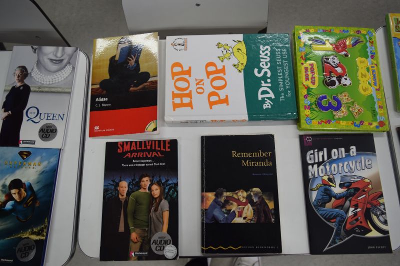 Os alunos escolheram livros com poucas páginas para lerem e fazerem sua roda de leitura. O objetivo foi ter contato com livros em inglês, com temas de pop up, passatempo etc.