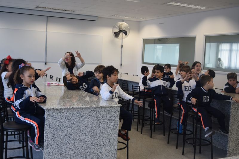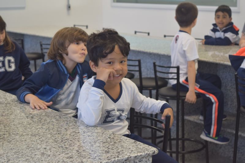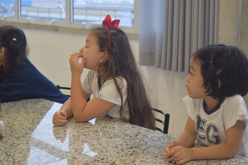 Os alunos do Nível II, da Educação Infantil, orientados pelas professoras Daniela Peres, Rosemeire de Freitas e Débora de Cássia Dantas, aprenderam sobre a existência de água nos vegetais.