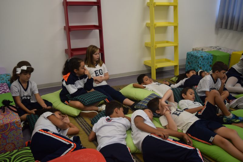 Com esse intuito, os alunos do 3º ano A e B do Ensino Fundamental, orientados pela Profª Paula Coracini e Aparecida Carrasco, foram até a sala de leitura do espaço multimeios, para ouvir um conto.