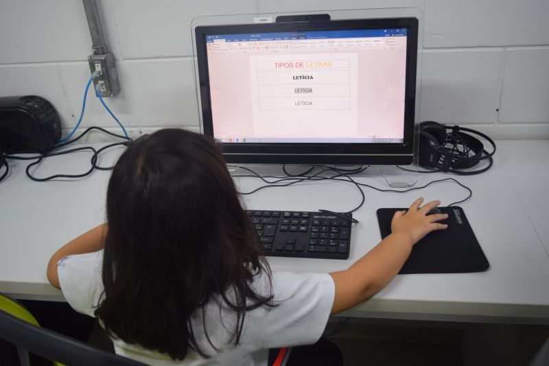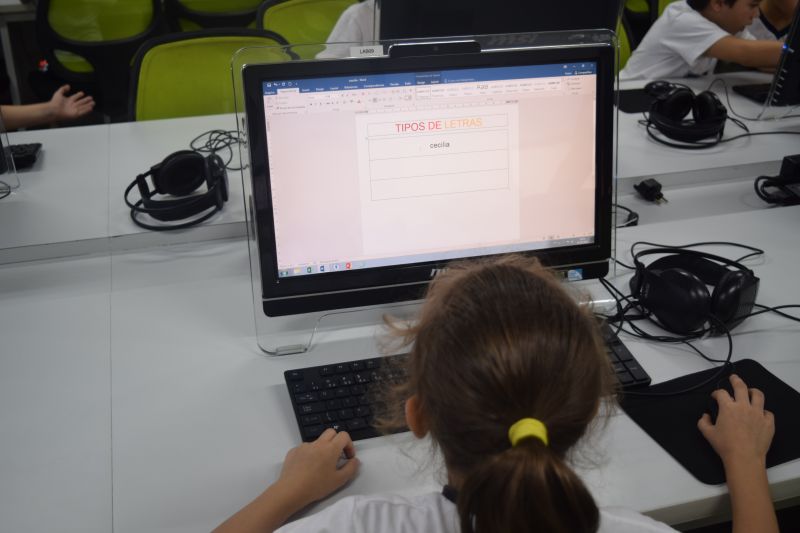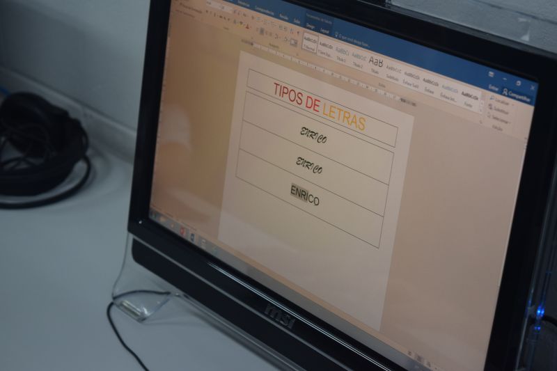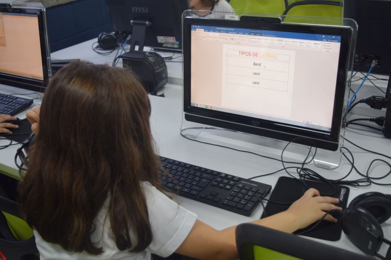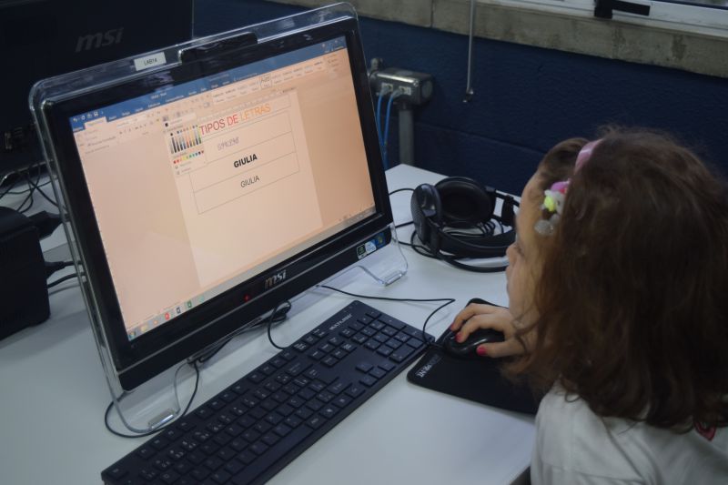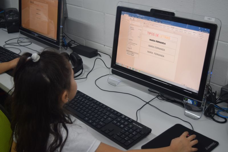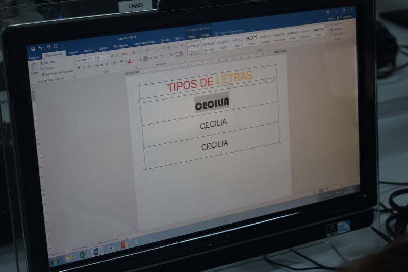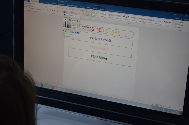 No Laboratório de Informática, os estudantes utilizaram a ferramenta de texto Word, para digitar seus respectivos nomes, de diferentes formas e em cores variadas.