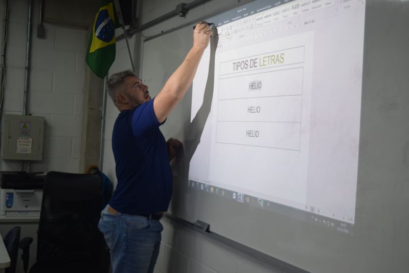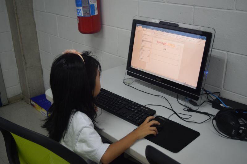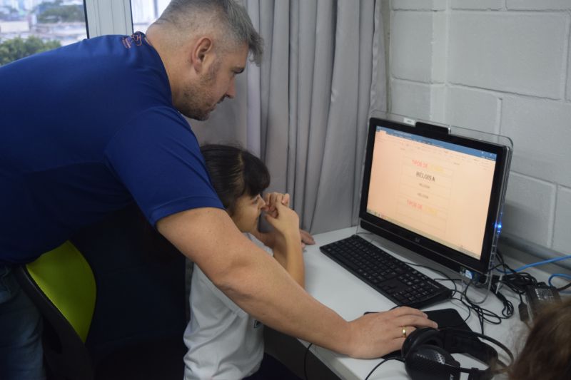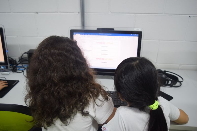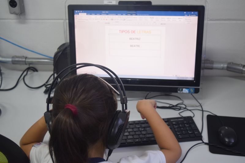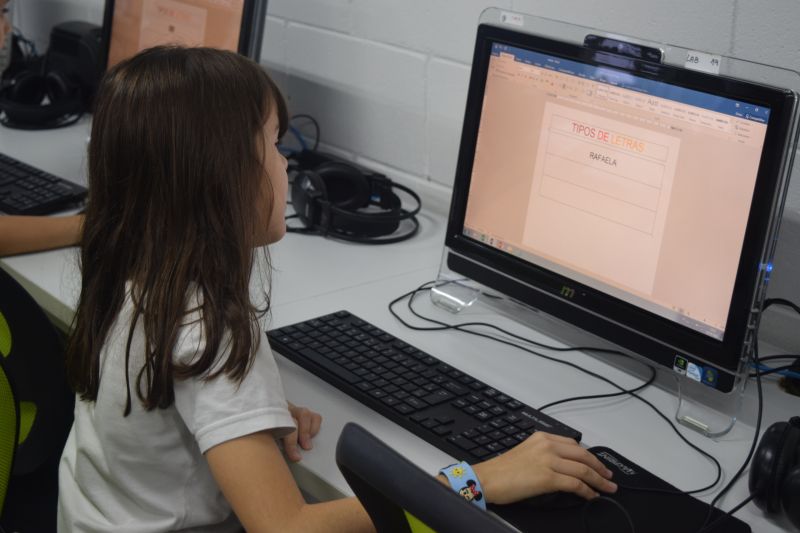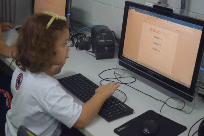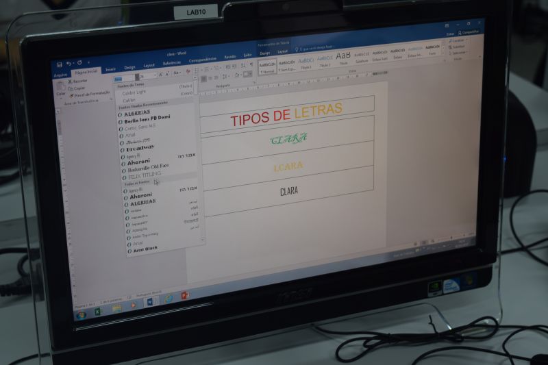 No Laboratório de Informática, os estudantes utilizaram a ferramenta de texto Word, para digitar seus respectivos nomes, de diferentes formas e em cores variadas.