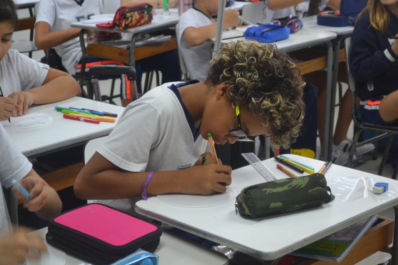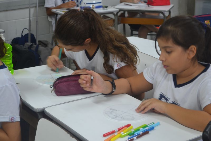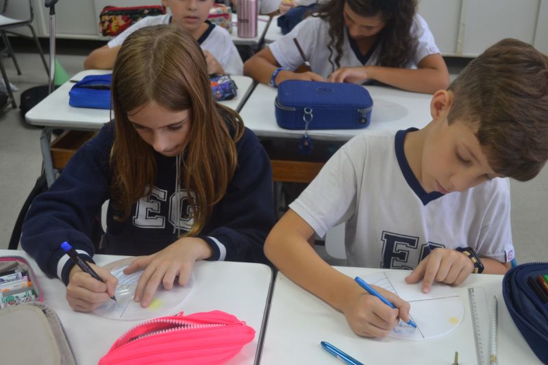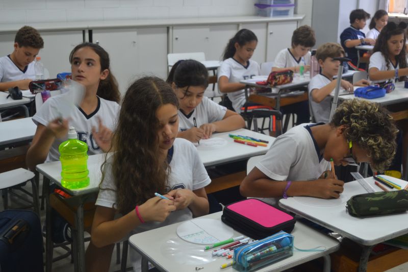 Os alunos do 5º ano do Ensino Fundamental, orientados pela professora Maria Eugenia Ribeiro, reproduziram o ciclo da água durante a aula.