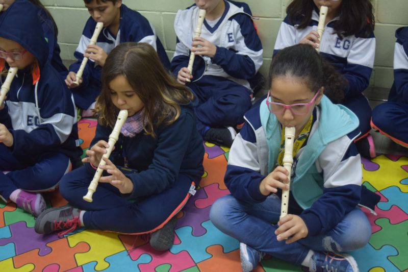 Os alunos do 3º ano do Ensino Fundamental, orientados pelo Prof. Gideon, de Música, montaram uma bandinha de xilofones e, junto com um coral, ensaiaram a música Leãozinho, composta por Caetano Veloso, em 1977.