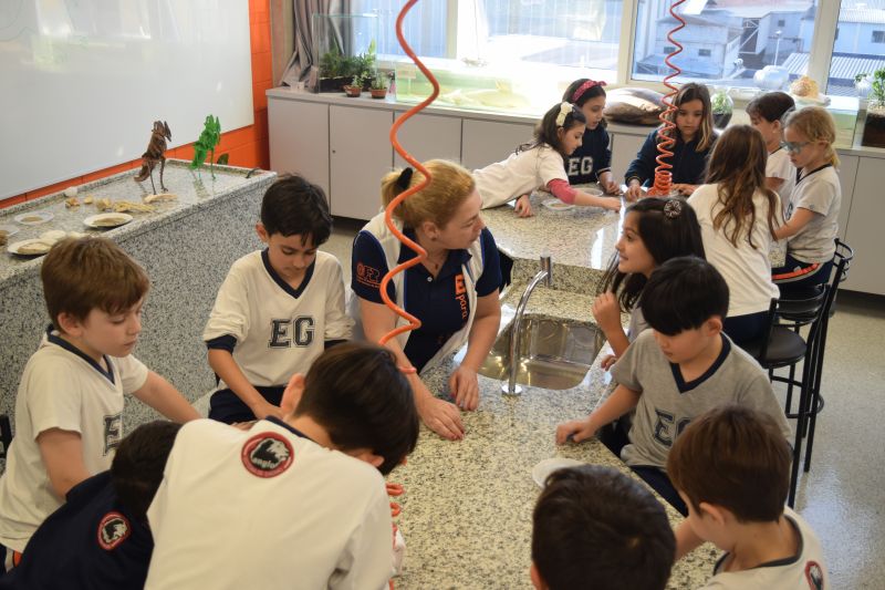 Os alunos do 3º ano do Ensino Fundamental, orientados pela Nutricionista ThaÃsa, confeccionaram réplicas de fósseis no laboratório de ciências do Colégio.