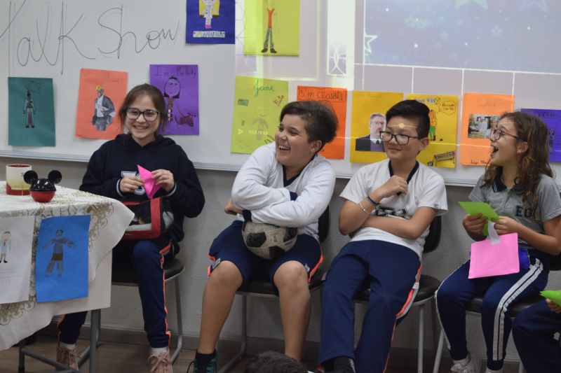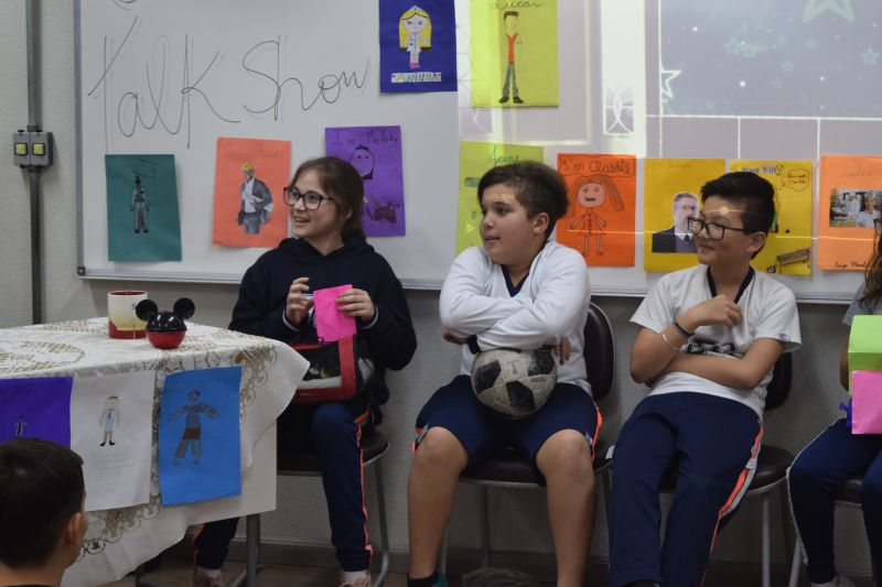 Os alunos do 5º ano, orientados pelas professoras de Inglês, Roberta e Amanda, realizaram um Talk Show cheio de diversão e aprendizagem durante as apresentações para finalizar as unidades trabalhadas no 2º trimestre.