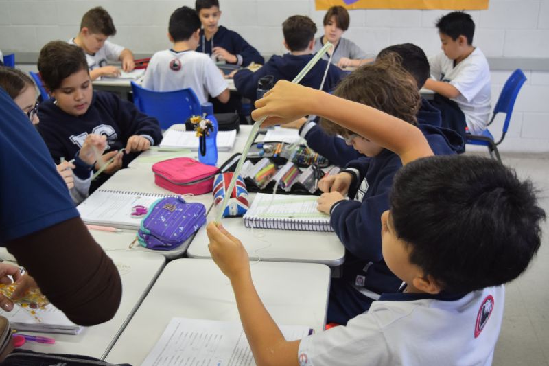Utilizando canudos e barbante, os alunos construíram polígonos e observaram que, mesmo apertando o barbante, apenas o triângulo se mantinha rígido. Utilizada em estruturas de pontes e torres, os triângulos são bastante utilizados nas construções, pois apresentam segurança e rigidez.