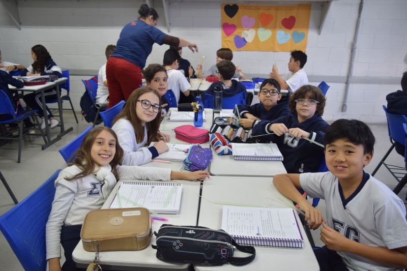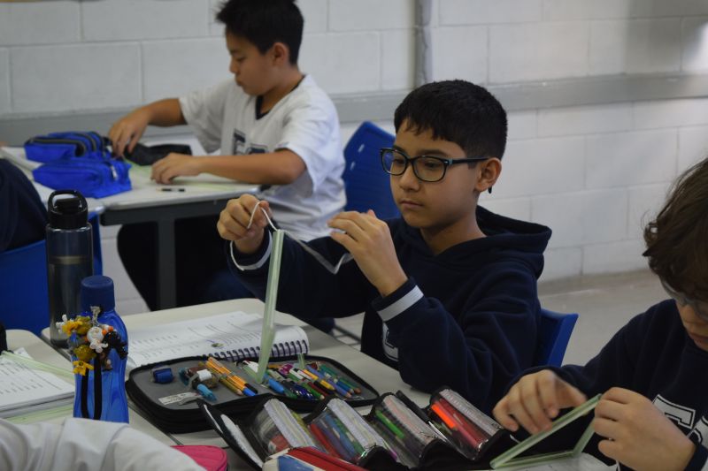 Os alunos do 5º ano do Ensino Fundamental, orientados pela Profª Tânia Pequeno, estão montando uma novela com o assunto “Propriedades do Triângulo”, e chegou a hora de construírem polígonos durante a aula.