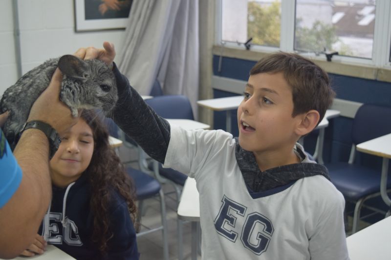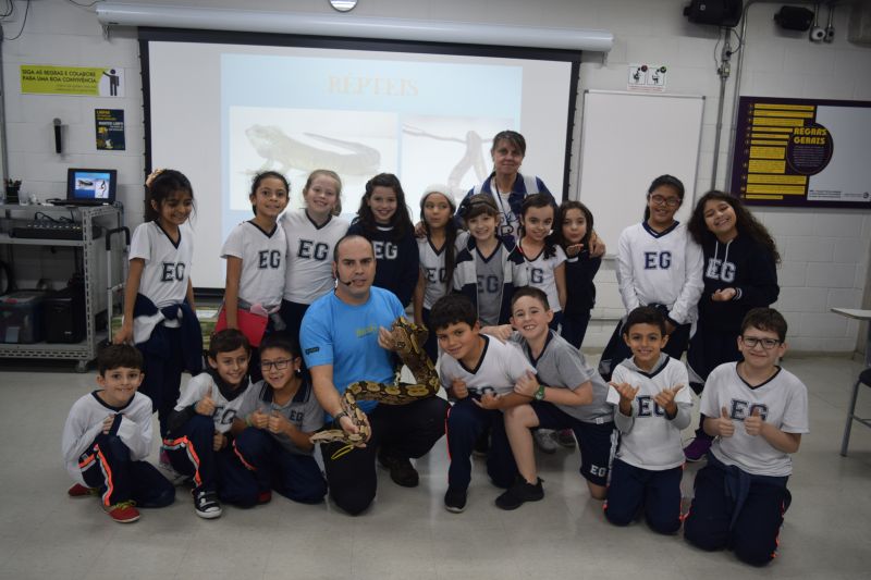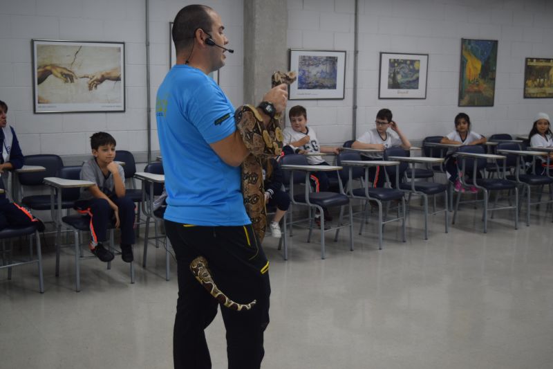 Mas, antes de embarcarem nessa aventura, uma visita muito especial marcou o dia. O Biólogo André Costa trouxe alguns animais ao Colégio e proporcionou diversão e conhecimento para os alunos.