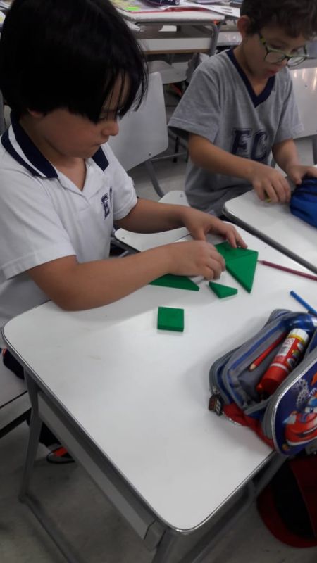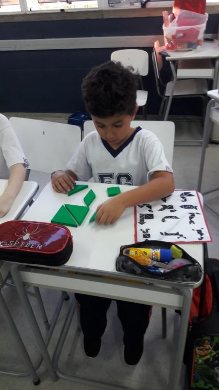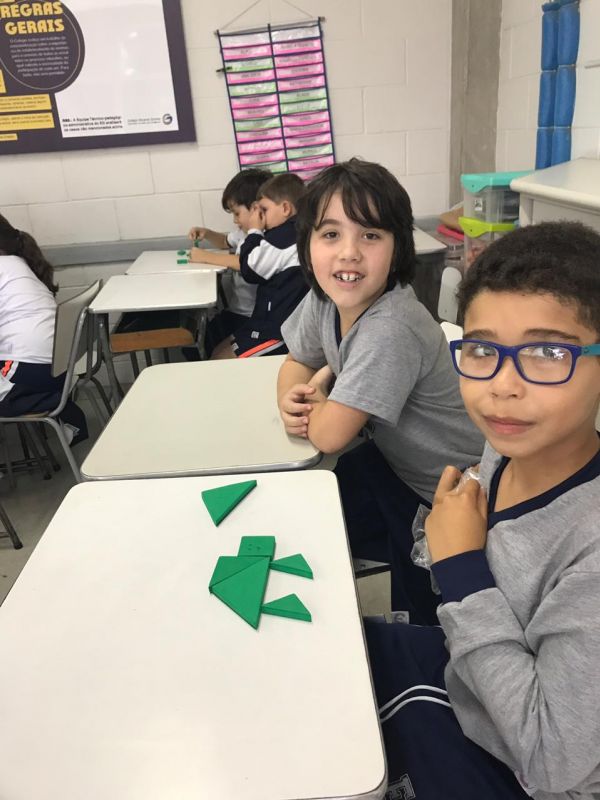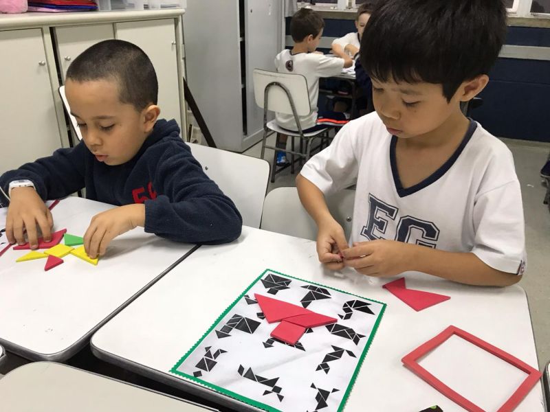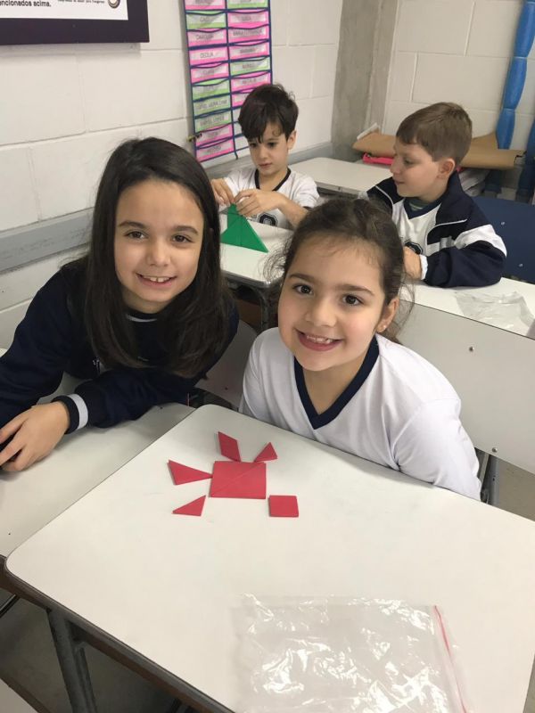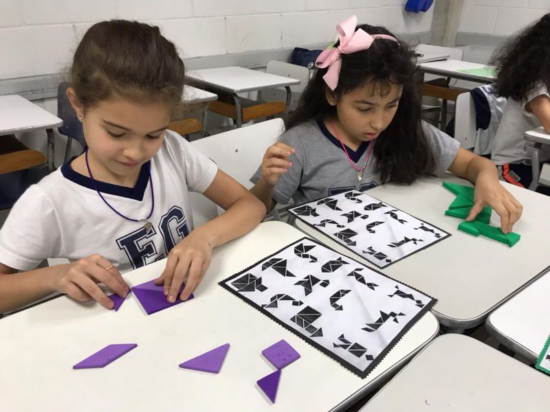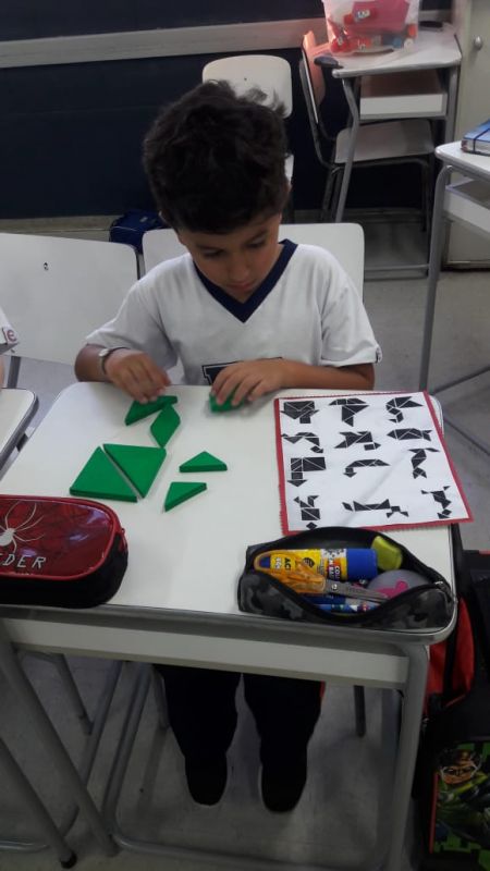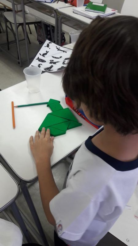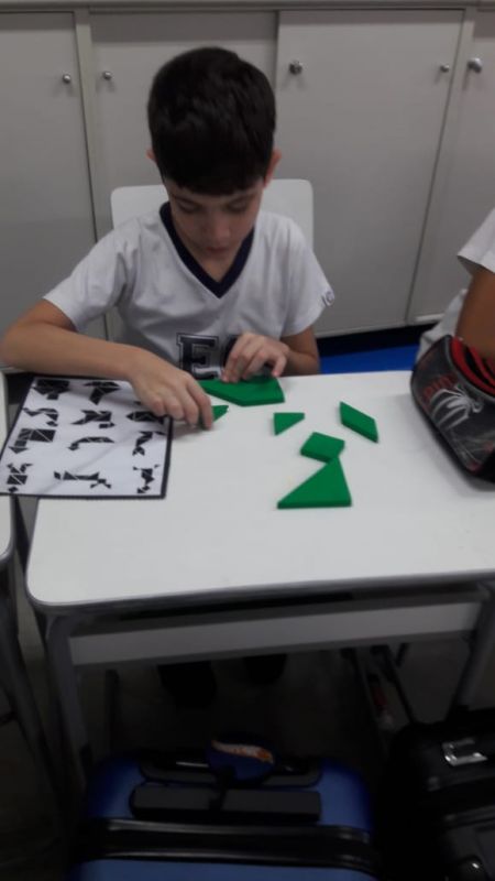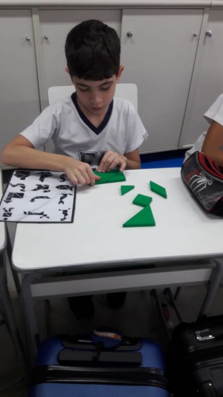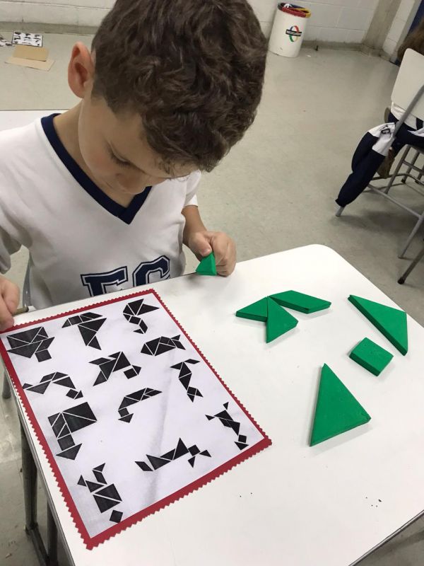 Os alunos do 2º ano do EF deixaram os brinquedos brasileiros de lado e conheceram um brinquedo de origem chinesa: o tangram, um quebra-cabeça geométrico composto por 7 peças, chamadas tans. Entre essas peças, estão 2 triângulos grandes, 2 pequenos, 1 médio, 1 quadrado e 1 paralelogramo. Com elas, é possível criar muitas figuras.