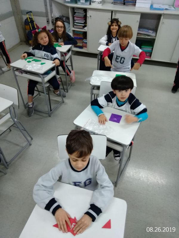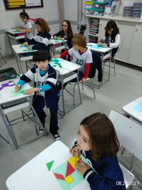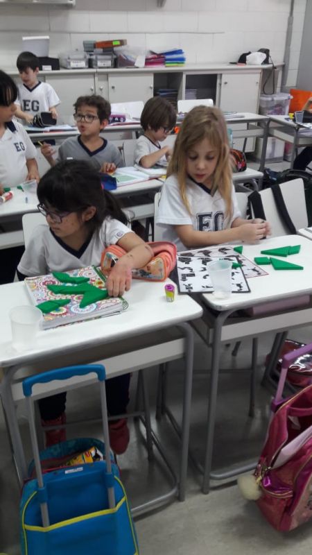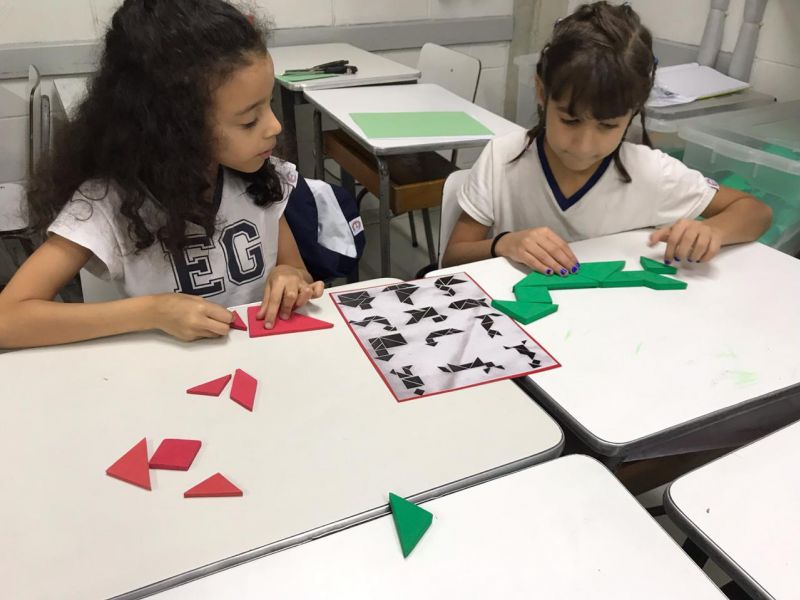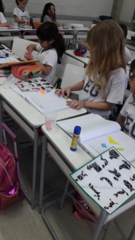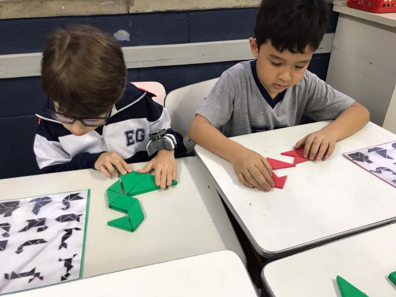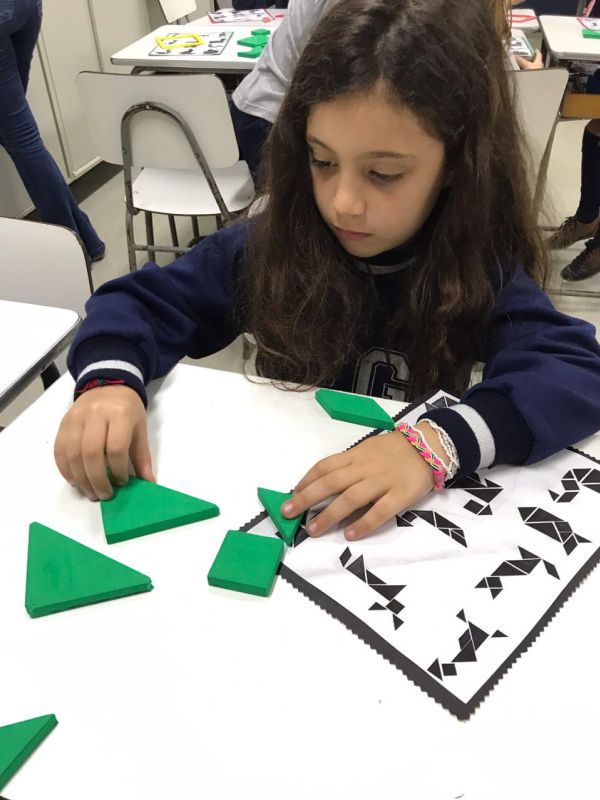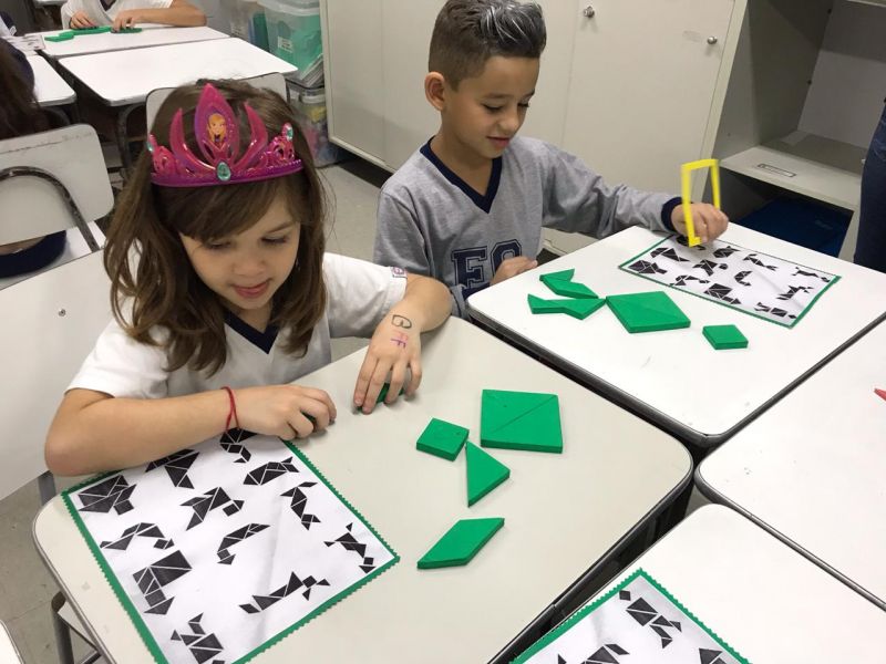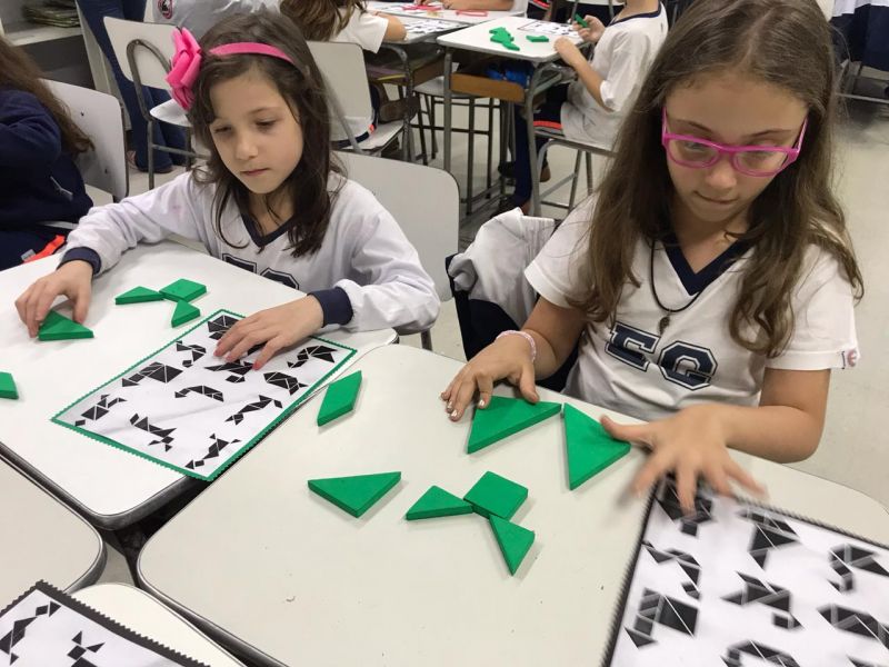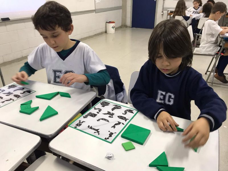 Os alunos do 2º ano do EF deixaram os brinquedos brasileiros de lado e conheceram um brinquedo de origem chinesa: o tangram, um quebra-cabeça geométrico composto por 7 peças, chamadas tans. Entre essas peças, estão 2 triângulos grandes, 2 pequenos, 1 médio, 1 quadrado e 1 paralelogramo. Com elas, é possível criar muitas figuras.