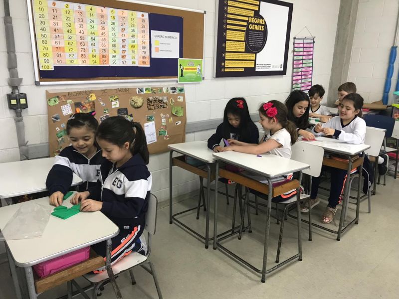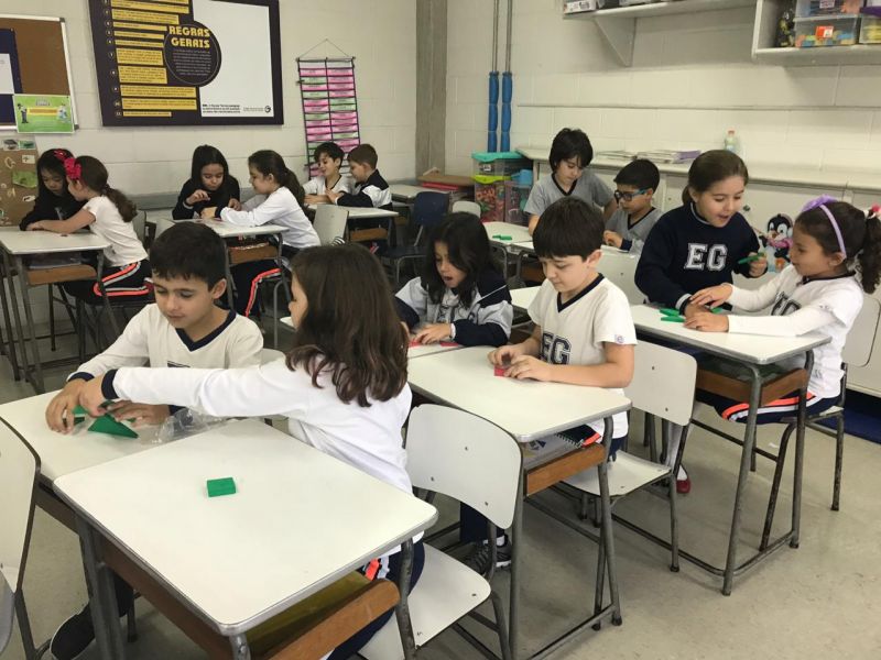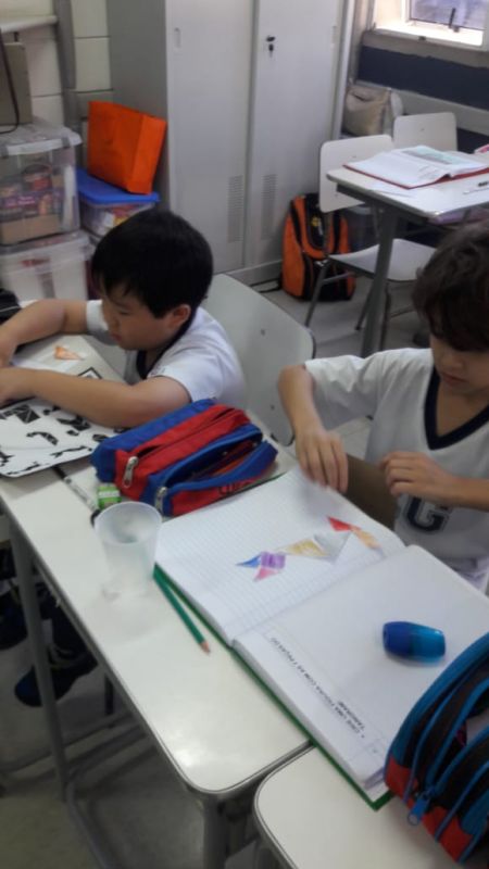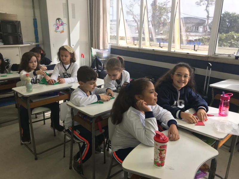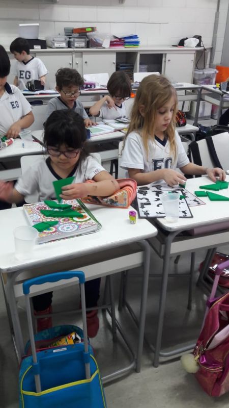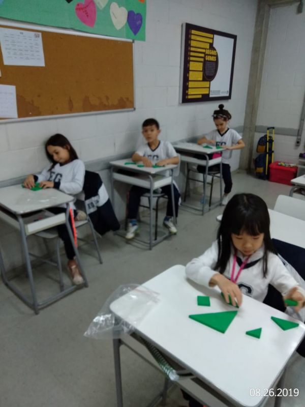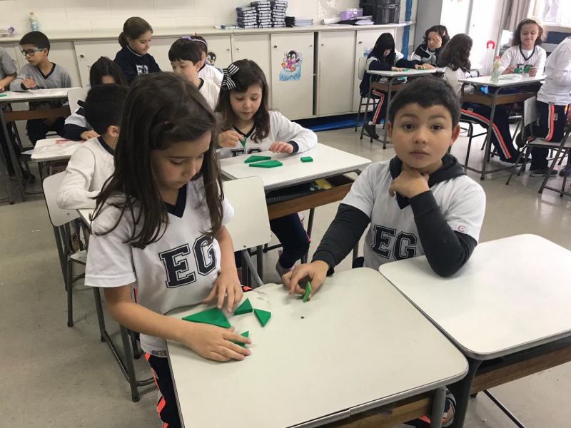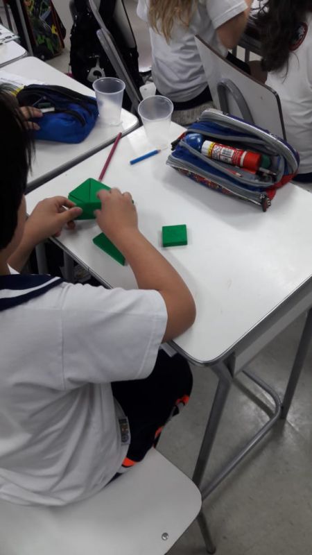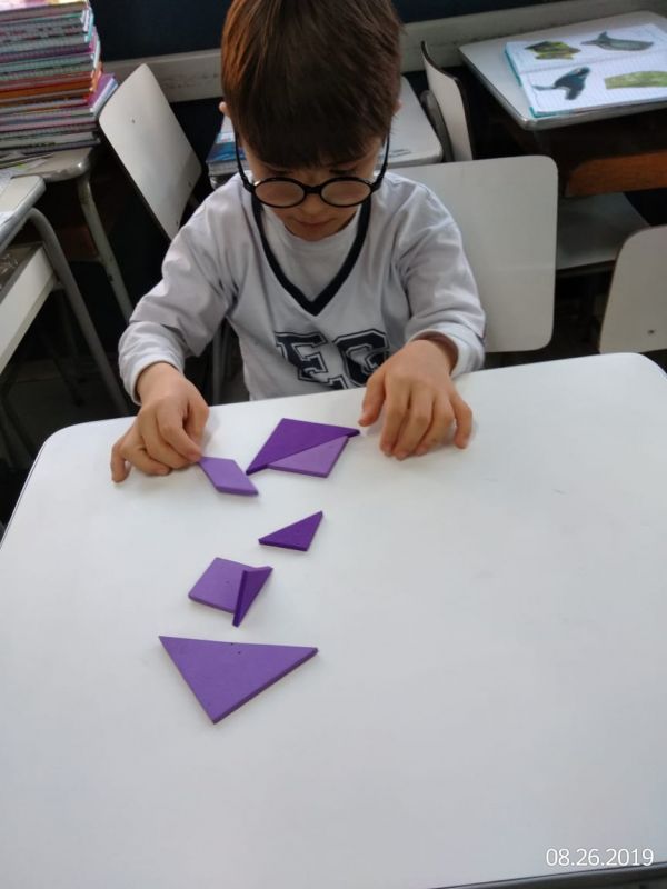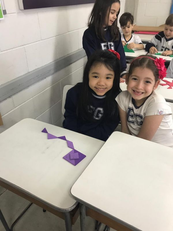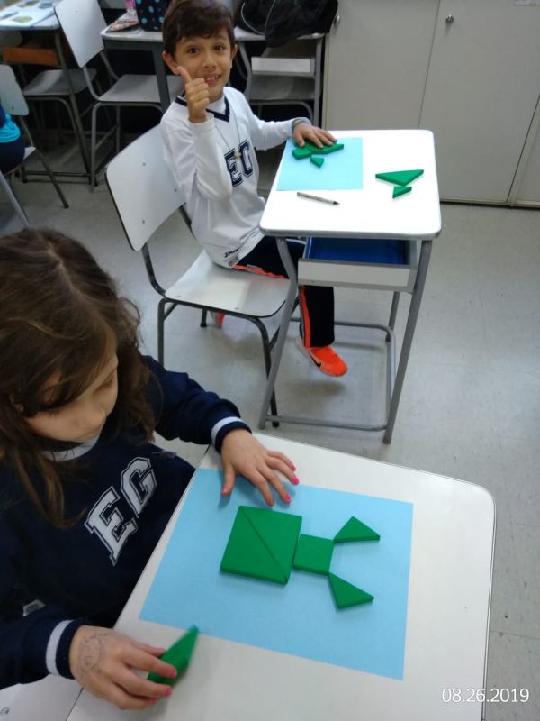 Os alunos do 2º ano do EF deixaram os brinquedos brasileiros de lado e conheceram um brinquedo de origem chinesa: o tangram, um quebra-cabeça geométrico composto por 7 peças, chamadas tans. Entre essas peças, estão 2 triângulos grandes, 2 pequenos, 1 médio, 1 quadrado e 1 paralelogramo. Com elas, é possível criar muitas figuras.
