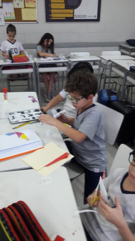 Após a aprendizagem sobre o tangram, os alunos produziram, em sala de aula, as próprias peças.