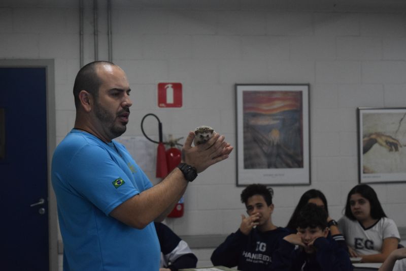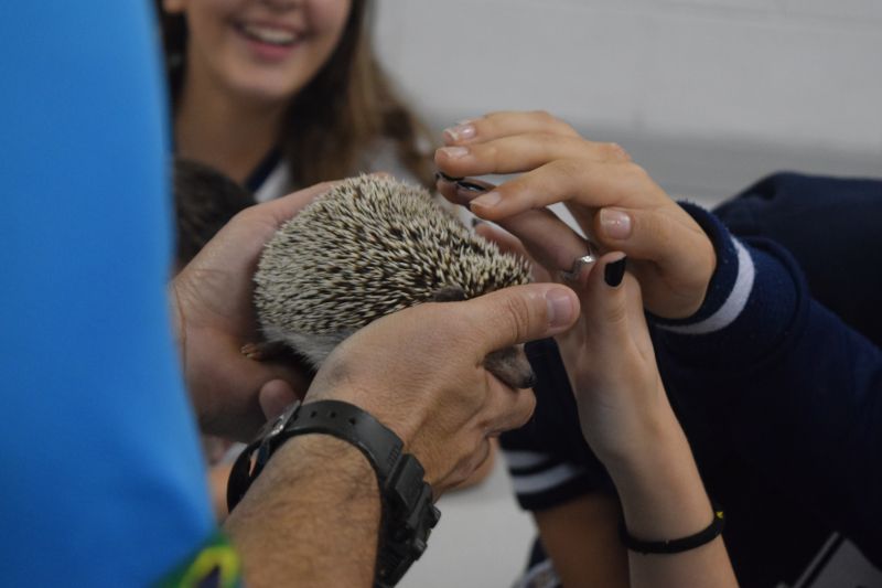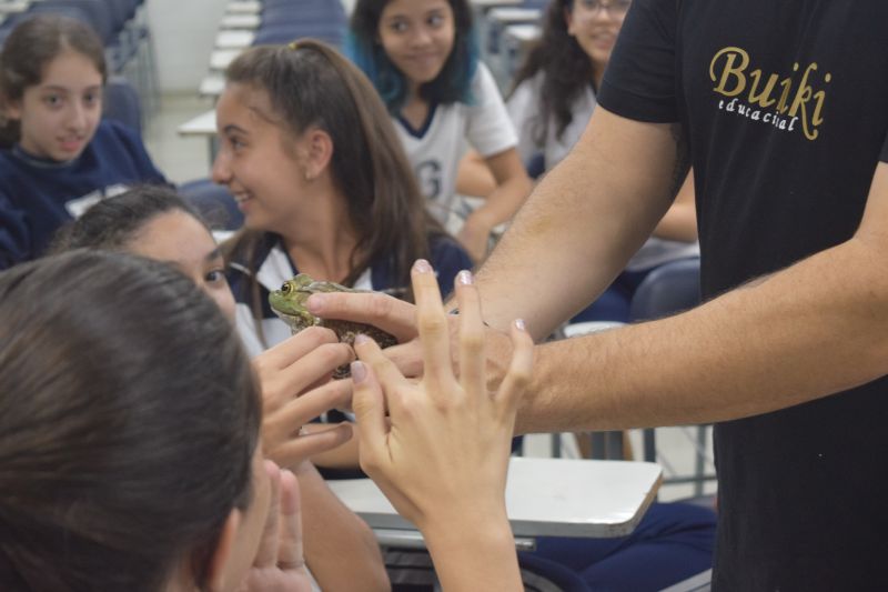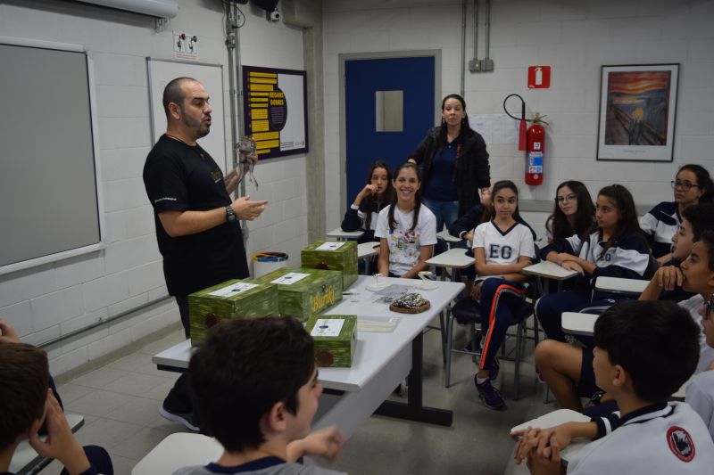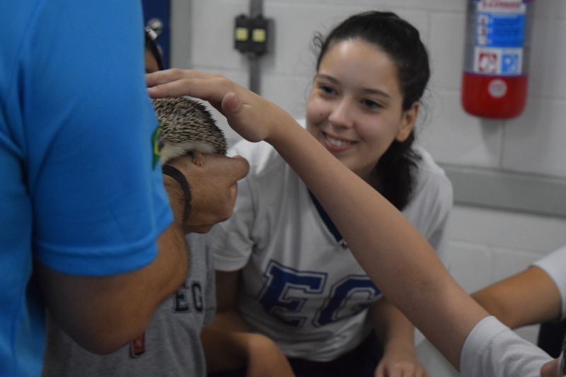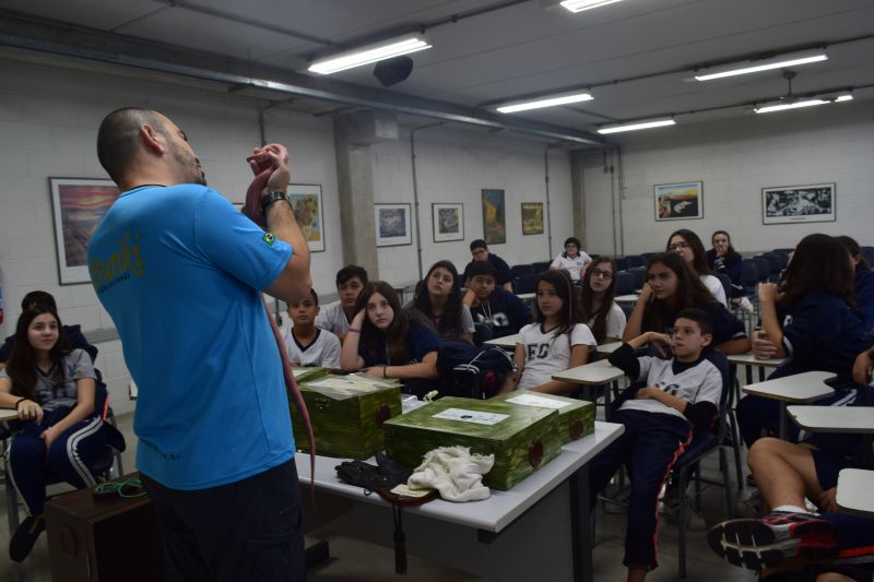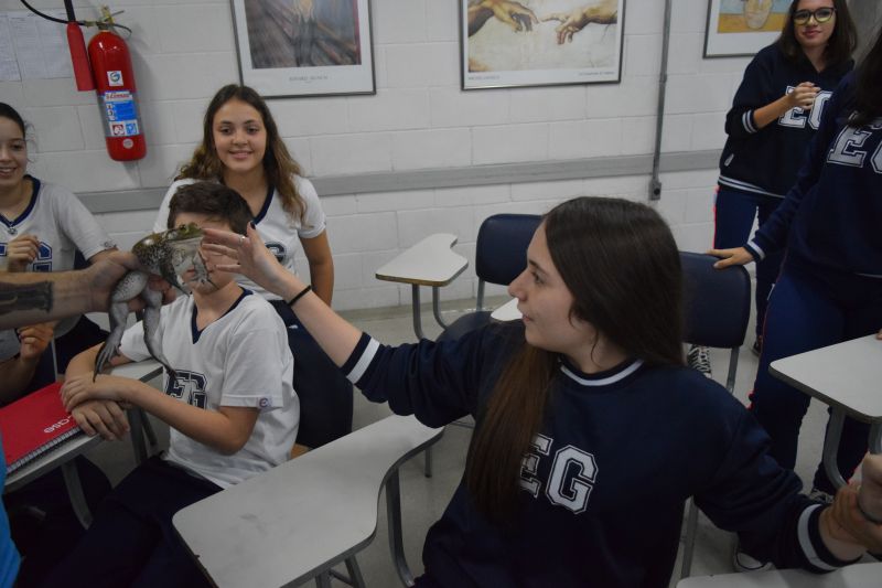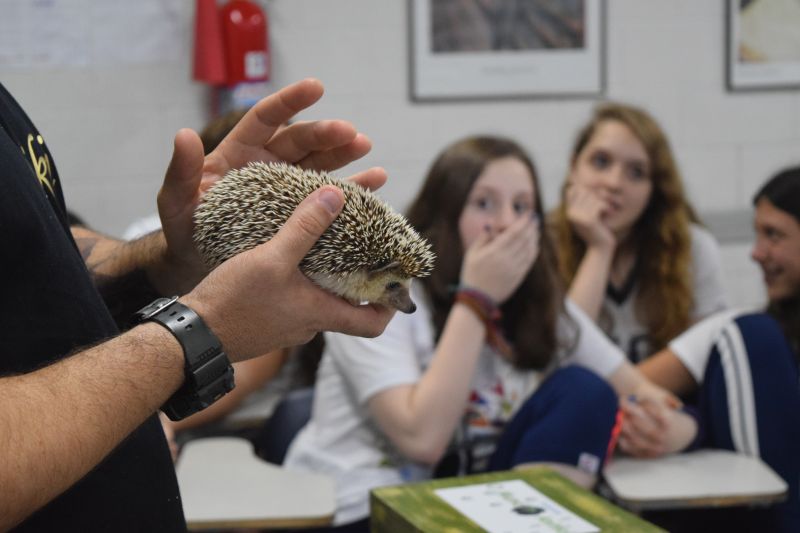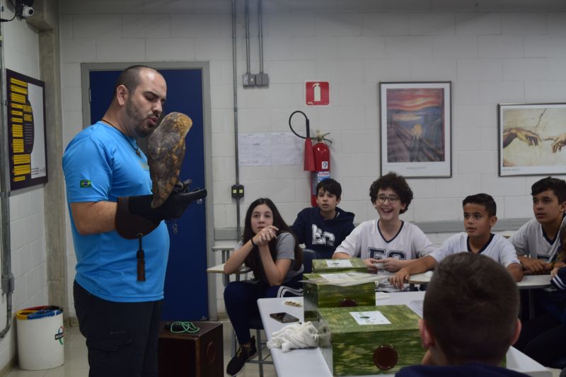 Com o auxílio e as explicações do Biólogo André Costa, da empresa Buriki Educacional, os alunos concluíram os estudos sobre esse assunto, em contato com aranha, sapo, ouriço (porco espinho), cobra e coruja.