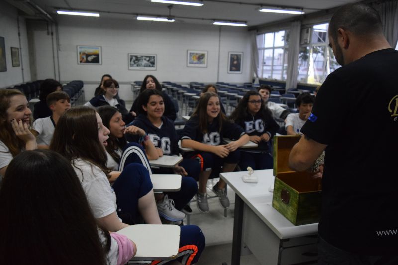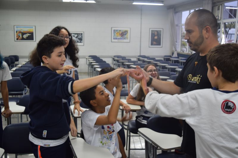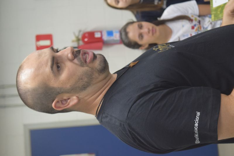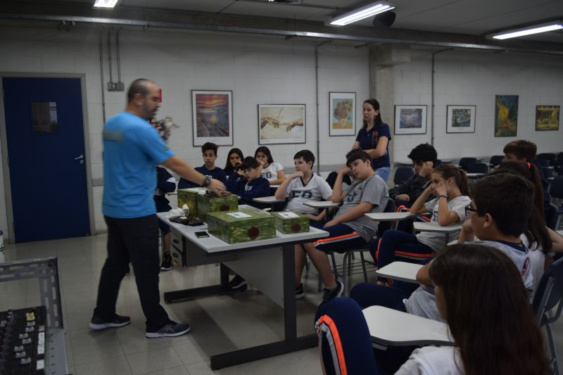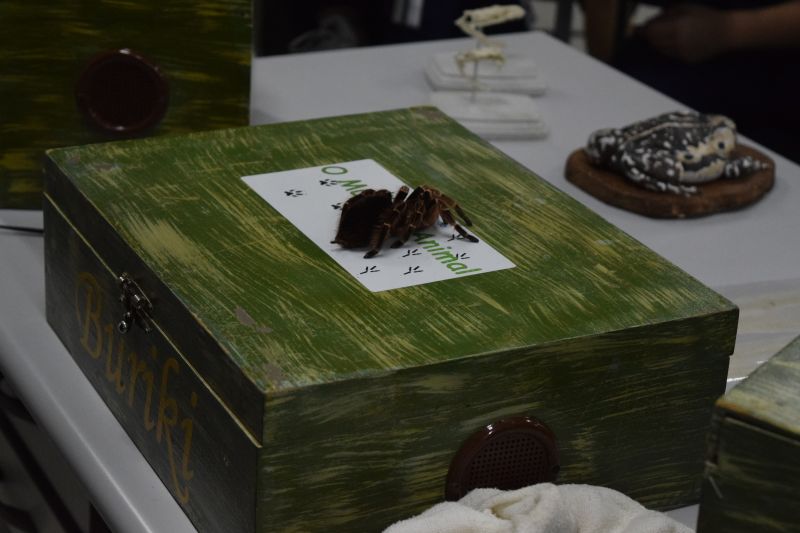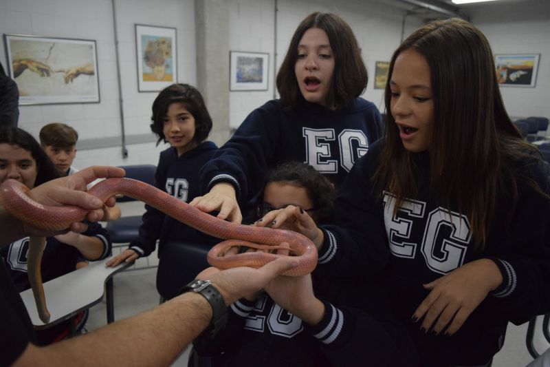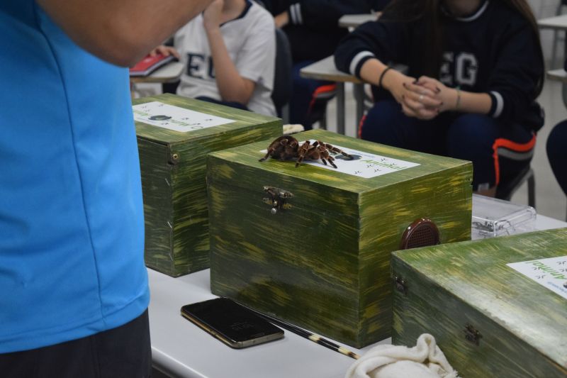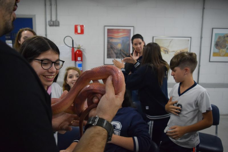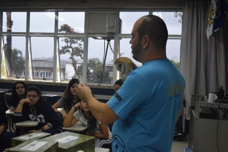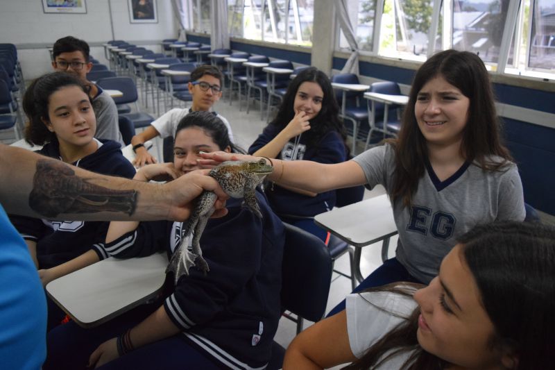 Com o auxílio e as explicações do Biólogo André Costa, da empresa Buriki Educacional, os alunos concluíram os estudos sobre esse assunto, em contato com aranha, sapo, ouriço (porco espinho), cobra e coruja.